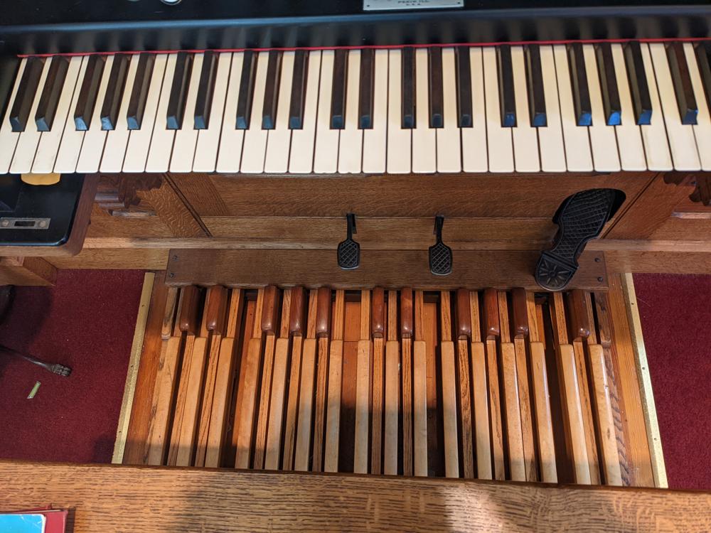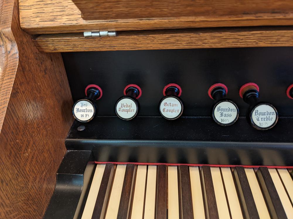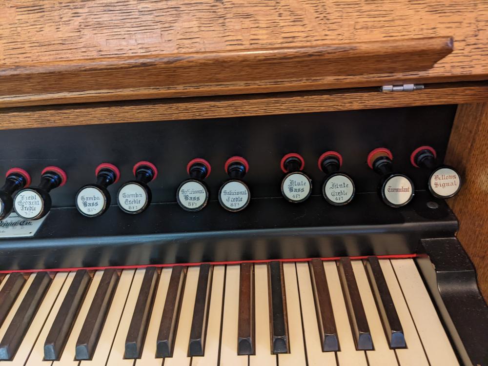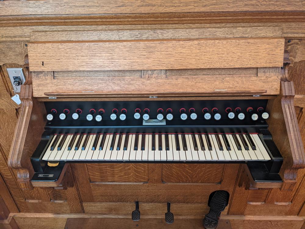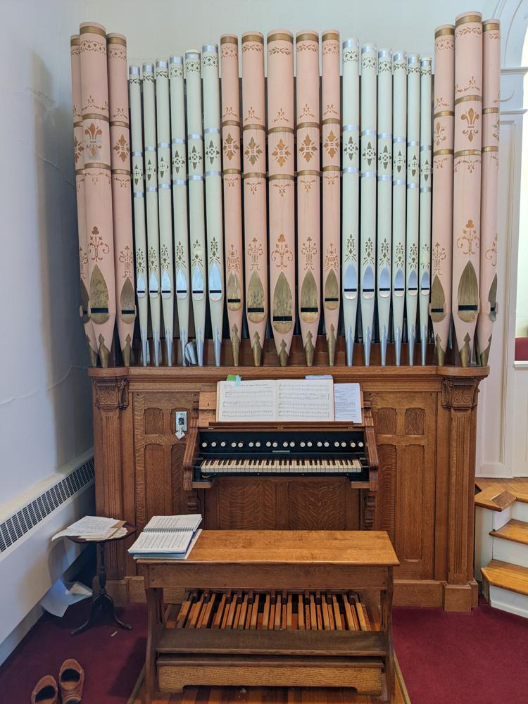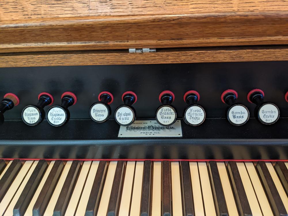 From the 'Music' page of the church website, *"The search for an organ to replace the previous Hammond electronic organ of 40 years began in 1983. The Gene Bedient Company, of Lincoln, Nebraska recommended to the search committee the early 1900’s Hinners pipe organ weighing 3,290 lbs with one manual (split) keyboard and 9 ranks of 453 pipes. This organ became available when two Lutheran congregations merged.*
