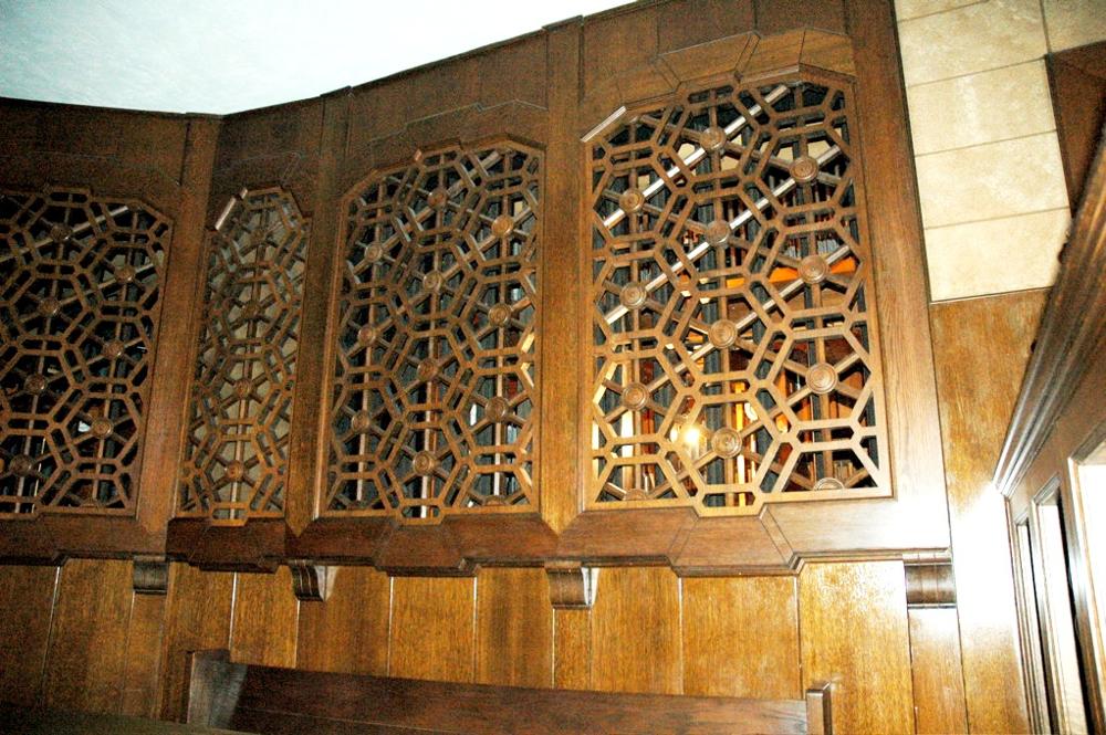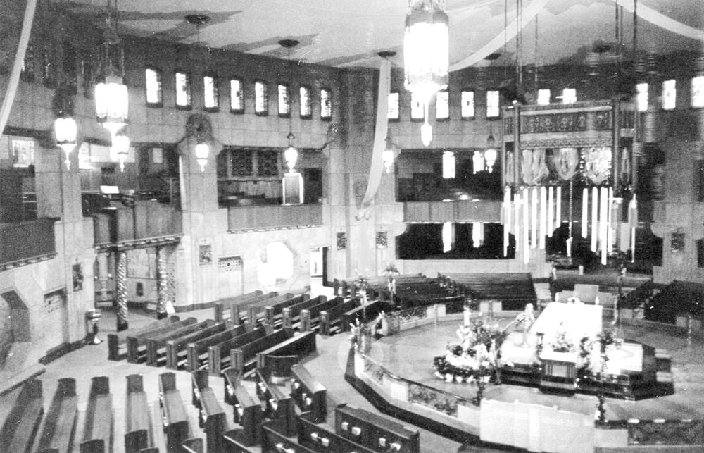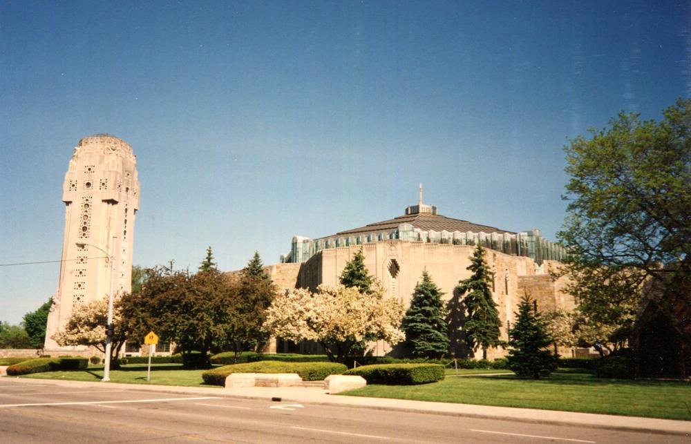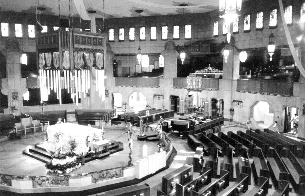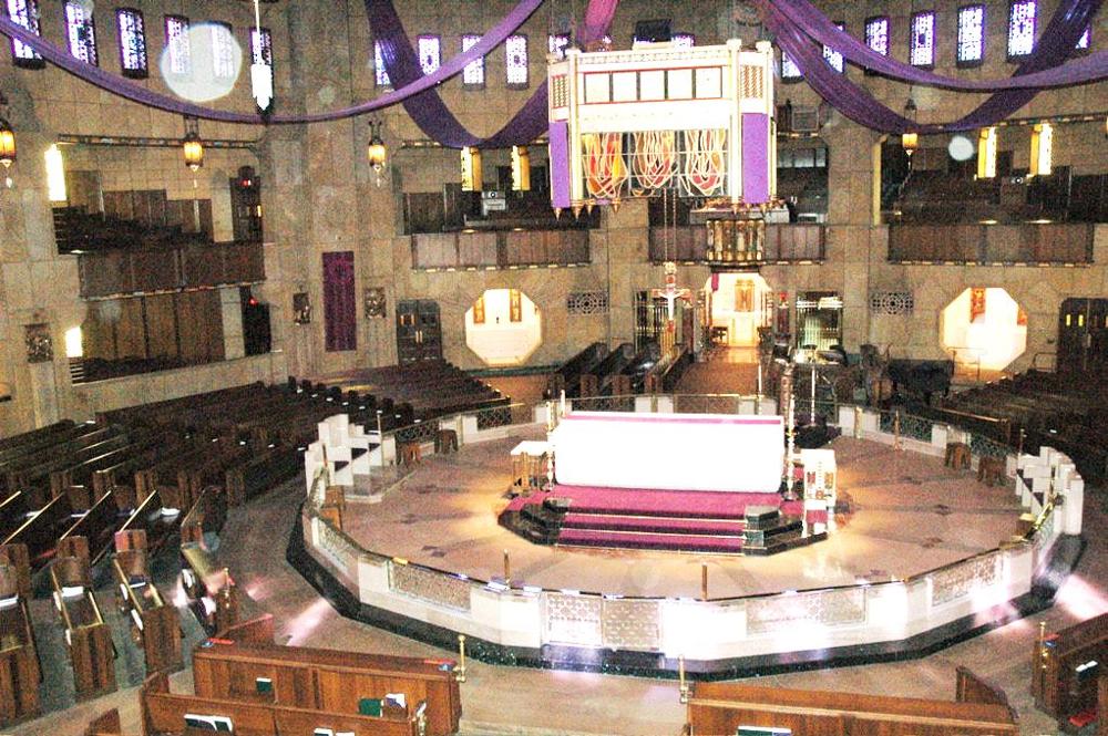 Updated through online information from Jeff Scofield. -- The 3,100-seat room is octagonal in shape; the 76-rank main organ is located chambers in the west part of the encircling gallery, along with one of the two duplicate consoles. The 20-rank Antiphonal organ is located below grills in the floor in front of the choir pews and second console. Except for the GT, SW and CH Ripieno mixtures, which draw other stops, all of the manual stops are independent. The Pedal has two Resultant flues and a full-length 32' Posaune.