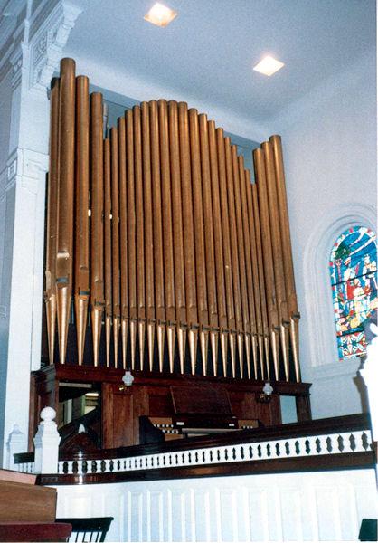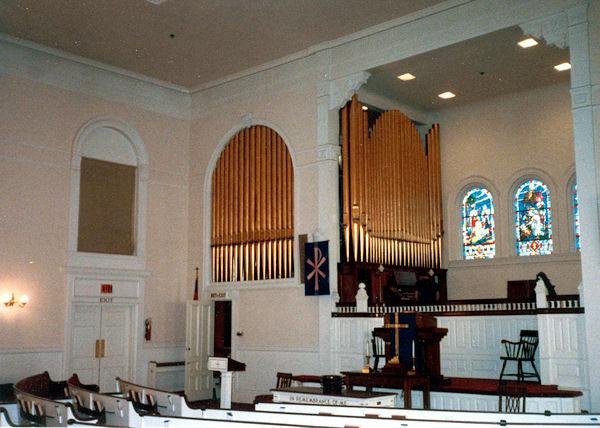 Updated through online information from Scot Huntington. -- After a 1955 electrfication and tonal enlargement of the original instrument by the Williams Organ Co. of Swampscott, Mass., the instrument had become mechanically unreliable by 1983. In 1985, the organ was rebuilt as an essentially new tracker-action instrument by Angerstein & Associates of Stoughton, Mass., reusing the original chamber, mahogany Hutchings casework, and gilded facade pipes. Almost all Hutchings pipework remaining after the Williams electrification was reused, but tonally modified by rescaling, repitching, and/or revoicing, with the addition of several new stops, including an enlargement of the pedal from 2 ranks to 5. The organ was dedicated on January 19, 1986, and formally "opened" in a recital by Rosalind Mohnsen on April 13, 1986. In 2011, the congregation merged with another congregational church in Arlington, and both the building and organ are for sale in 2012.