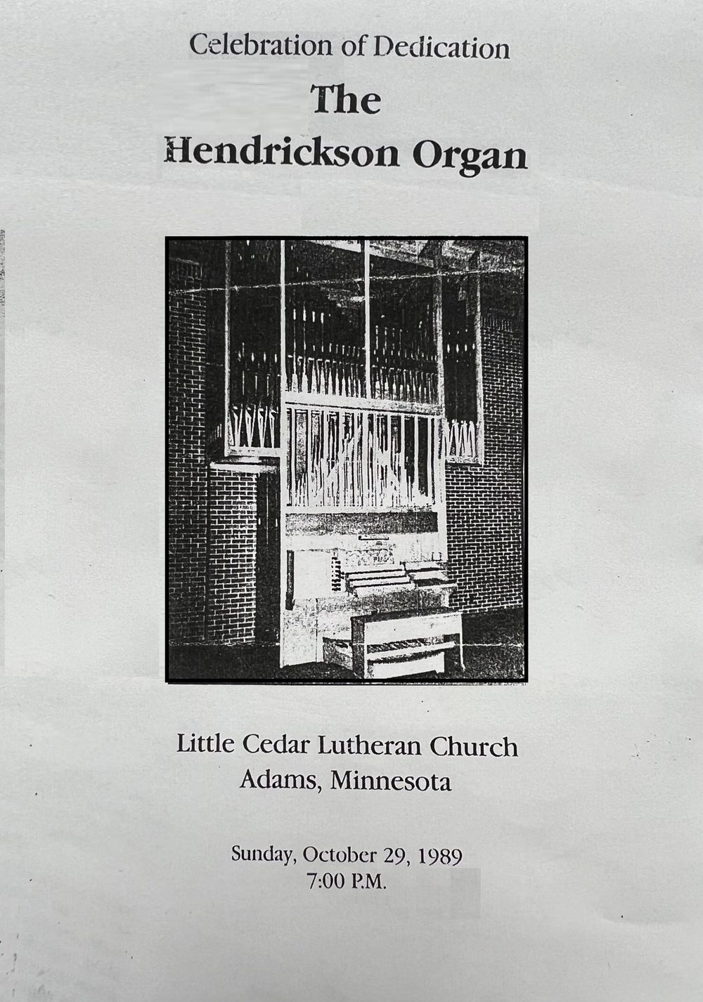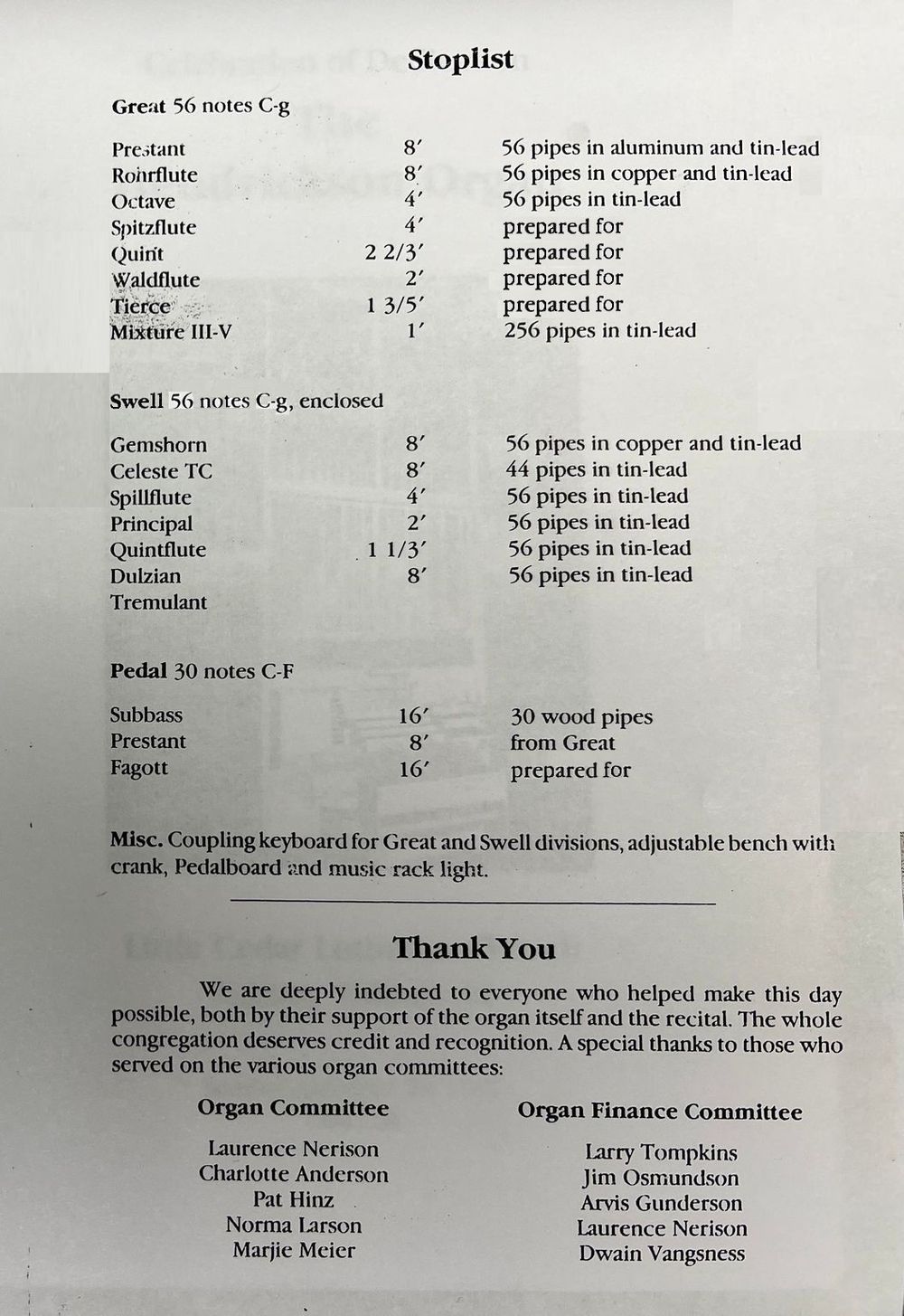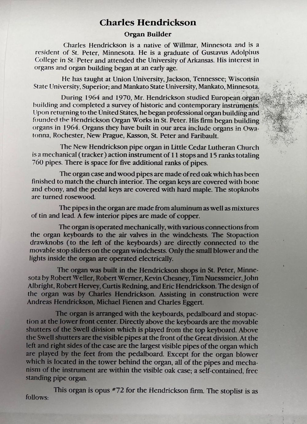 Dedicated 29 Oct 1989 by David B. Moklebust. 3 ranks added later.