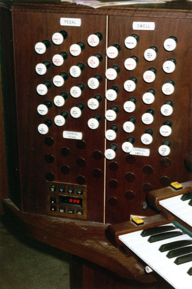 Updated through on-line information from James R. Stettner. -- I examined the organ in 1995. Housed in case of 1929 Wangerin. Six divisions: Great, Swell, Choir, Solo, String, & Pedal. Chancel Great and Chancel Swell prepared-for with 10 blank drawknobs each. String division enclosed with Solo, and coupled via Solo couplers. Prepared-for stops: Gt: III Cymbale; Ped: IV Mixture; and Ch: Zymbelstern. Some Wangerin ranks retained. The two Pedal 32' flue stops are electronic 12-note extensions.
