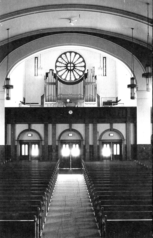 In March 1919, B. Schaeffer & Sons of Schleissingerville, Wisconsin, installed a pipe organ in the lower church; in 1924, they moved it lo the upper church. It was replaced there in 1949 by a three-manual instrument built by the Wangerin Organ Co. of Milwaukee, at a cost of $12,500. This instrument may have incorporated some parts of the Schaeffer.