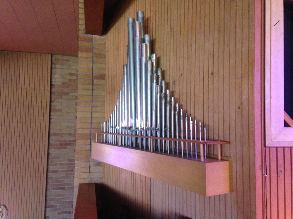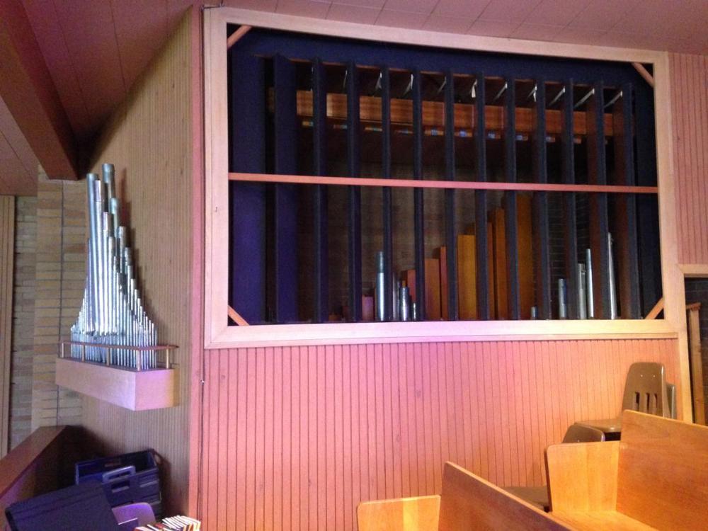 Updated through online information from James R. Stettner. -- The organ as originally proposed was to have been 6 unified ranks: 8' Principal, 16' Rohr Flute, 8' Viole, 8' Viole Celeste (tc), 8' Dulciana (tc), and 8' Oboe Horn (tc). An exposed and non-expressive 4' Principal was added to the contract, and the Viole and Viole Celeste were replaced by a Gemshorn and Gemshorn Celeste. The inspiration for the exposed 4' Principal was very likely St. Monica's on Mercer Island, Washington, which had been built by the same builder the previous year.