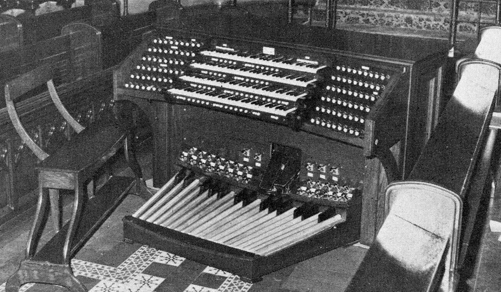 Updated through online information from James R. Stettner. -- Oak console with walnut and rosewood interior. Pedal had a full-length 64' Bombarde Ravalement.