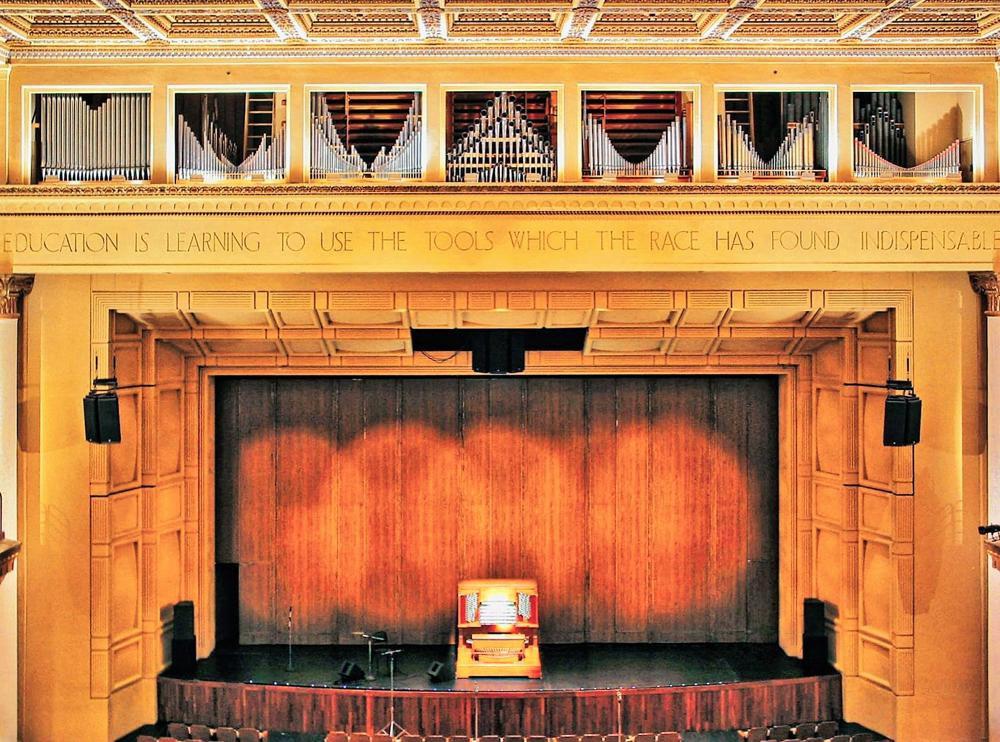 Updated through online information from Richard Harrold. -- HISTORICAL INFORMATION (also taken from the tech-spec PDF and corrected of errors): The Royce Grand Pipe Organ is here due in large part because of the generosity of the Harvey Mudd family and the vision of the University Provost Ernest Carroll Moore. Provost Moore enlisted Harold Gleason to design and install the instrument. The original side chambers were too small to house the organ as designed by Gleason and he persuaded the architects to allow the pipes to be placed over the proscenium arch. Installation and tuning was completed in the summer of 1930 and the inaugural concert was given by Gleason on Sept 9, 1930. <br> Alexander Schreiner was the first University Organist and gave tri-weekly organ concerts. Thomas Harmon, who assumed the position of University Organist, supervised the first renovation in 1969, which included replacing the original Skinner Console with one by M. P. Mőller. Upon completion of this renovation, Schreiner was invited to perform the inaugural concert. <br> Over the years, the organ's magnificent sounds could be heard in recordings and live concerts with the Los Angeles Philharmonic: it added to the solemnity of academic convocations and commencement ceremonies and soon became recognized as one of the largest and most historically significant organs in Los Angeles. <br> Having survived two damaging earthquakes (those of Long Beach, 1933, and Sylmar, 1971), a couple of fires and, in 1980, the flooding of the basement blower room by a gatecrasher, who accidentally snapped off a sprinkler head while trying to gain access through a smoke vent in the roof, the organ received extensive damage in the 1994 Northridge quake, which silenced it and closed Royce Hall for four years while seismic improvements were performed. <br> Though Royce was closed from 1994 to 1998, it wasn-t until February 1999 that the organ made its own encore, fully restored and better than ever after more than $1 million in repairs and renovations. Thanks to a $150,000 gift from the Ahmanson Foundation, the organ has been expanded with a new Bombarde division of 24 ranks of pipes, bringing it to a total of 104 ranks and more than 6,500 pipes (debatable - we need an accurate, incontrovertible pipe-count! R.H.). <br> Reflecting the musical tastes of the era, the Skinner organ of 1930 was essentially orchestral or symphonic in style, designed to play transcriptions of 19th-century orchestral and operatic music as well as organ music of that style. "The renovation goal," said then University Organist and UCLA Music Department Professor Thomas Harmon, "was to repair and preserve the original organ intact and, with new additions, to increase its versatility in the performance of German Baroque and French Romantic and contemporary music". <br> A new state-of-the-art five-manual console by Robert Turner of Turner Organs was installed, with the fifth manual controlling the new division of the instrument. The organ's robust sound has been further enriched by Royce Hall's recent acoustical renovations, which have lengthened the reverberation time. The care and supervision is now being guided by the current University Organist, Professor Christoph Bull. Under Professor Bull's supervision, the multi-level capture system installed in 1982 has been updated with additional memory capability as well as MIDI interfaces.
