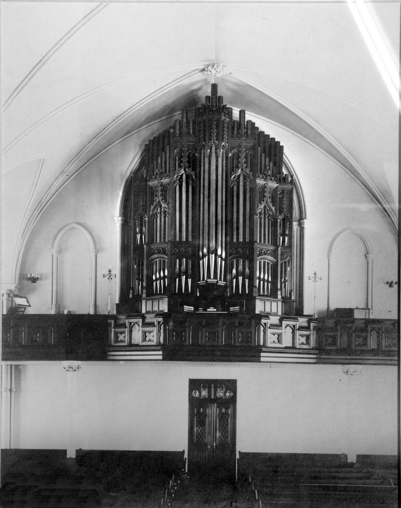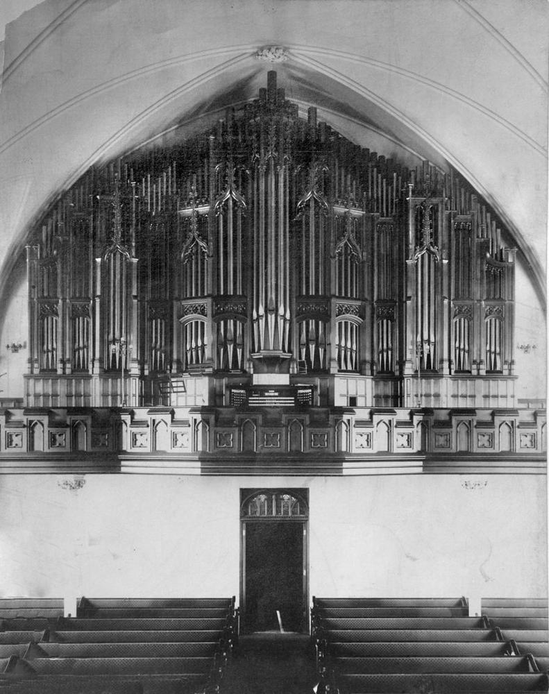 In 1907, the church was given another new organ, a three-manual electropneumatic instrument by Hutchings-Votey Organ Co. of Boston (Op. 2075). It incorporated pipework from the previous Hutchings instrument. Placed in the rear gallery, it had an ornate Gothic case. In 1914, Frank Foss, who soon thereafter moved his firm from Newton, MA, to New Bedford, enlarged the Pedal division. He added a Contra Bourdon 32' outside the tower chamber, on either side of the facade casework, and built new matching casework to house it. Once again, the church had the biggest and best organ in the city. According to the dedication program (Allan W. Swan, organist) of Thursday, April 25, 1907: