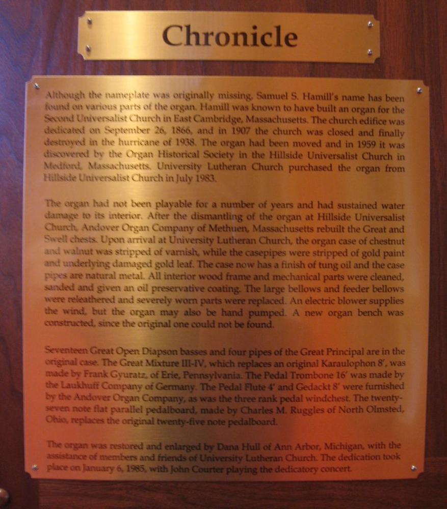 Related Instrument Entries: S. S. Hamill (1866) , Lewis Levering (1907) , Fowler-Hebert Organ Co. (2022)