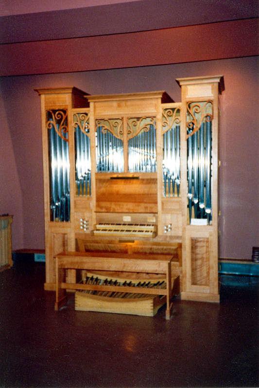 Updated through online information from James R. Stettner. -- The organ is free-standing in a case of Madrona. The 6-sectional facade contains 38 pipes arranged: 4-4-11-11-4-4. This is from the Man. I 4' Principal. The Man. I 2-2/3' Quinte is 1-1/3' pitch for the first octave. The Man. I 1-3/5' Terz starts at tenor G. The Man. II 8' Gedackt shares the bottom octave of the Man. I 8' Rohrflote. The organ has two, inter-changeable pedlaboards: one concave and raditating, the other flat and parallel. The tremulant affects the entire instrument. This is the Leon Mulling - Gilman Plunkett Organ, named after the two major supporters.