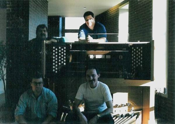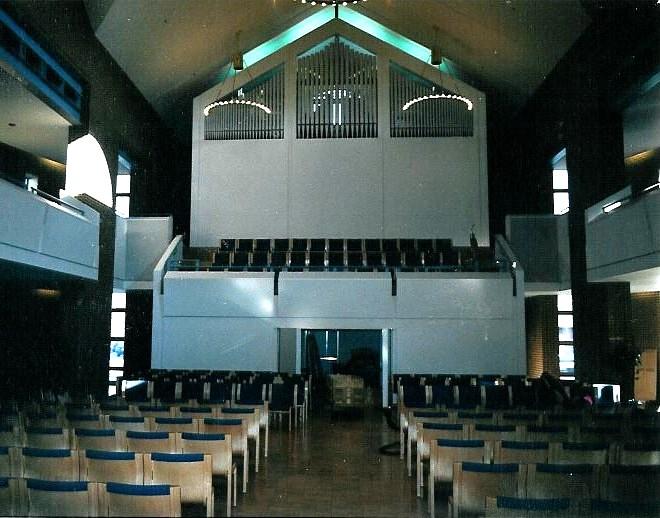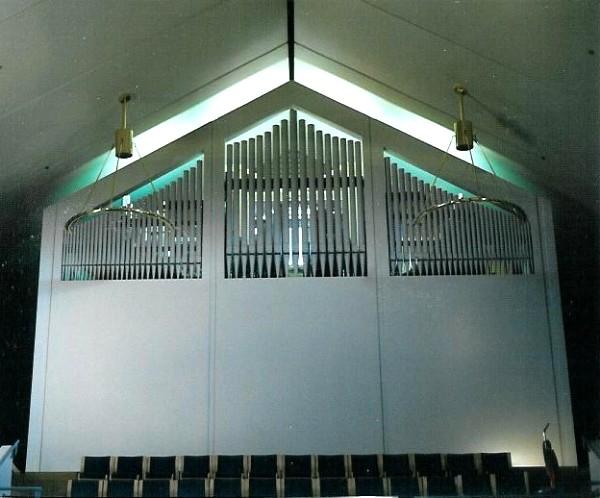 Identified through online information from James R. Stettner. -- New organ in brand new chapel building. Single large chamber above/behind front gallery where choir sits. Large triangular facade of pipes from Great 8' Principal, Positif 8' Principal, and Pedal 8' Principal. Facade pipes painted same color as walls to make them less obvious (per architect). Facade installed in October 1993 for dedication of new building. Organ installation begun after New Year, 1994 and completed by end of April. Slider chests per design of C.B. Fisk from 1950s. All manual divisions primarily on slider chests. Pedal on Kilgen-style E-P unit chests. Some recycled pipework (Möller, Austin, Aeolian, Unknown) contributed to project by Paul Sahlin of California. Some recycled pipework (Kimball, Bennett, OSI) from B and V inventory. Used chimes on new Peterson action. Organ prepared for additional registers/stops. Source: extant organ which I helped to build and install as a B and V employee.