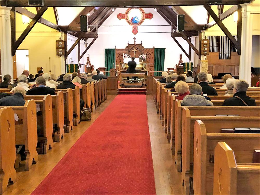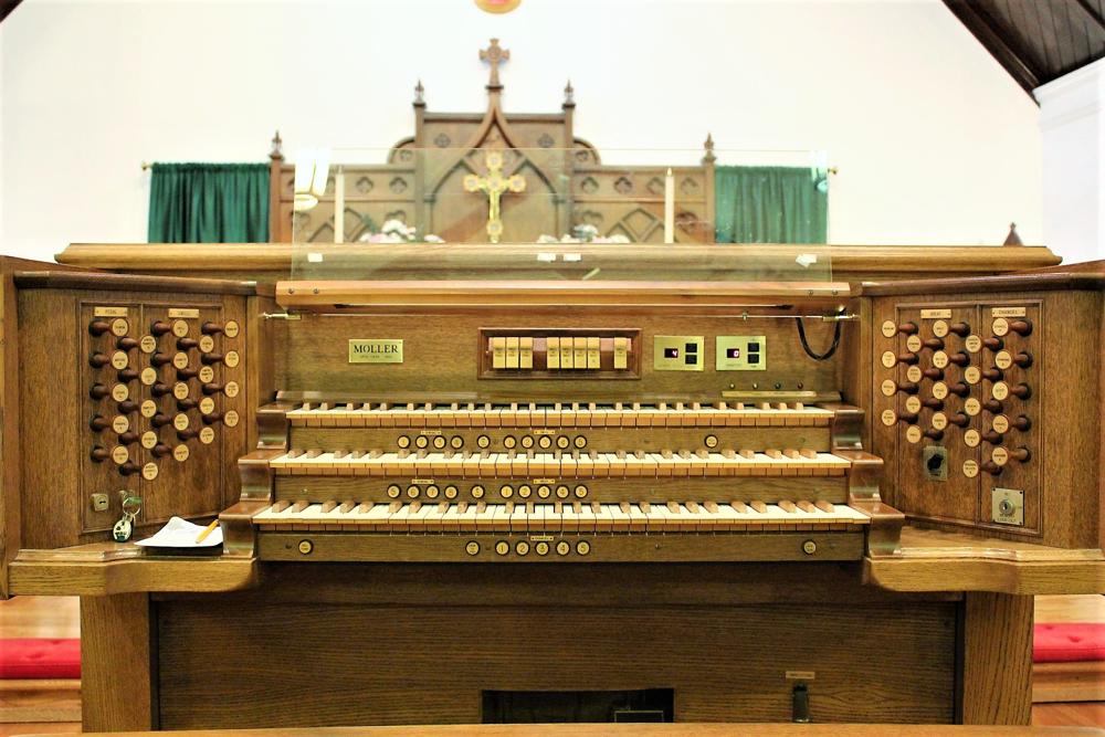 Updated through online information from Jeff Scofield. -- Chancel organ enclosed in cabinet in the front of the nave; the Great, Swell and Pedal are installed in a gallery over the rear doors.