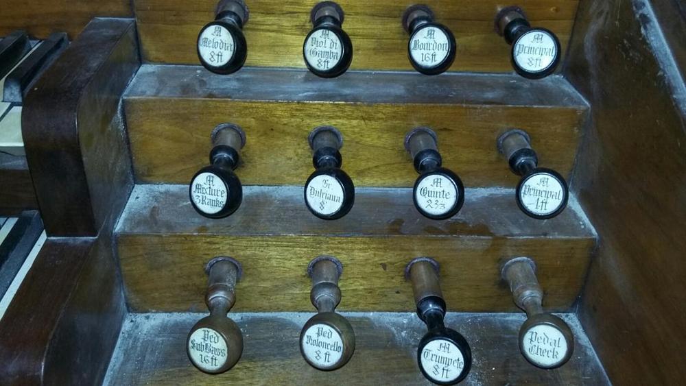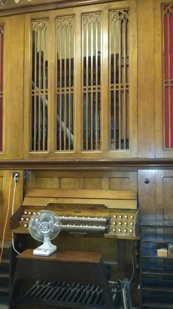 Updated through on-line information from Russell Nance. -- I did some work on this tracker action in the 1970s. I fixed a few air leaks and put some new leather on the SW to GT couplers. I visited the organ in 1999 and discovered that the roof directly above the organ leaked and damaged the keydesk and chest. At present (2008) the organ is unplayable. The congregation has not used the main sanctuary since the 1970s and has no money for organ restoration. In my opinion the organ should be sold and removed form the building. I was told by a previous organist that the organ was built in 1871 for the then Trinity Lutheran Church (later to become Prince of Peace Lutheran). The organ was probably rebuilt in 1891. A few of the original drawbars have the word "Manual" instead of "Great."