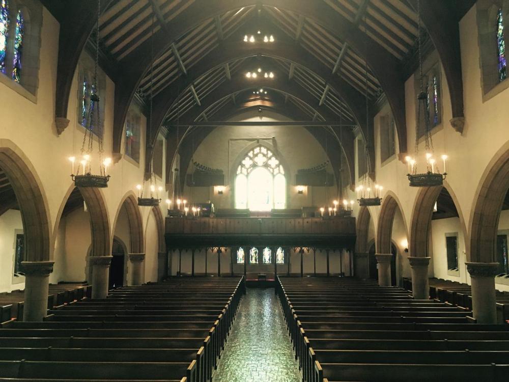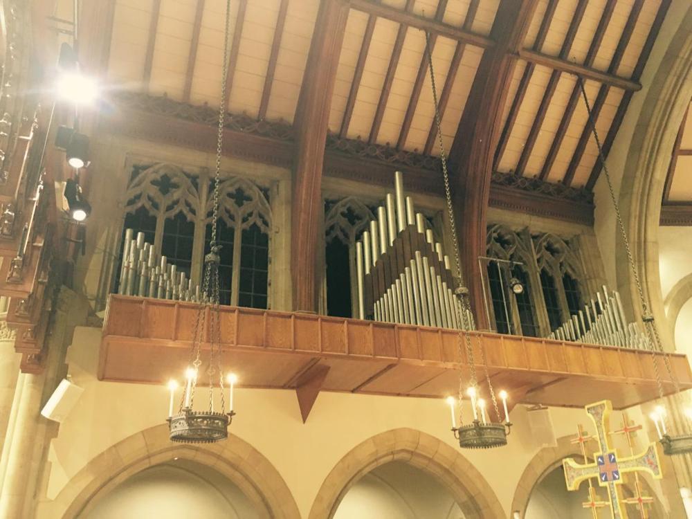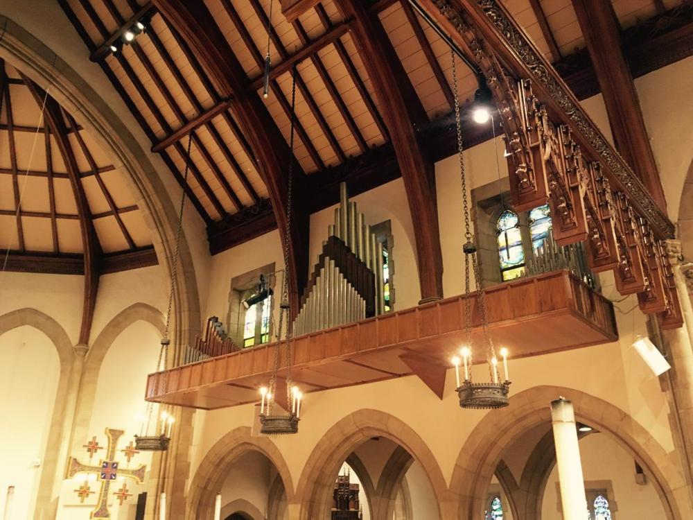 Updated through online information from Robert Wood. -- I was a young boy when the Schlicker crew made the installation. There were two swell chambers at the front, one on either side, and a swell chamber at the rear. There were exposed ranks of pipes in front of the louvers at the front. There were trompeta real pipes at the back pointed forward. The Schlicker replaced an older organ as I recall; there were old pipes lying around.