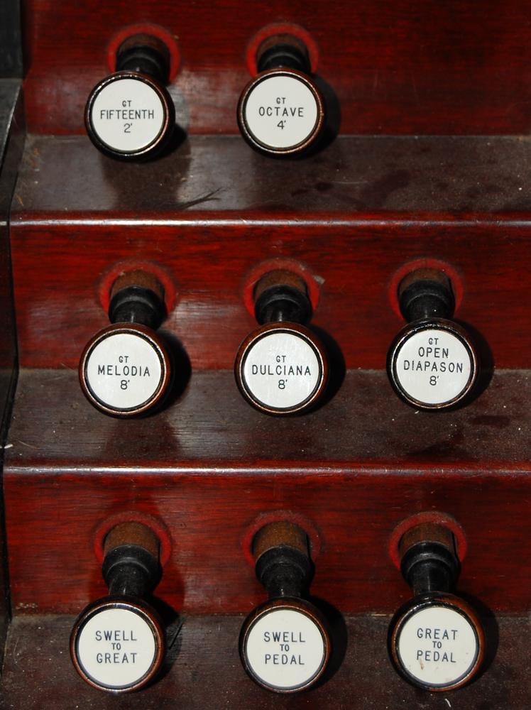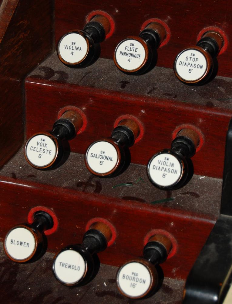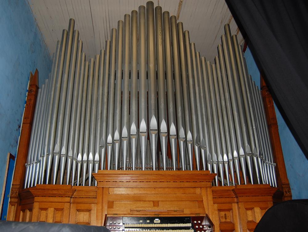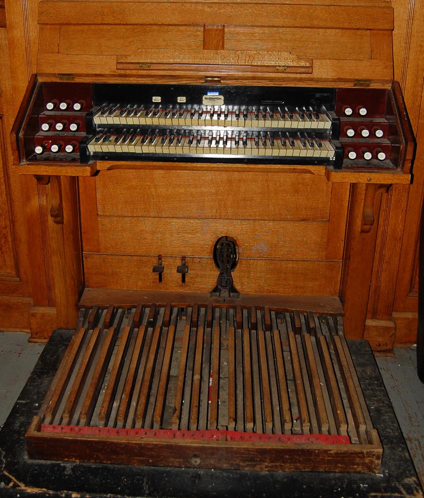 I visited the organ this afternoon; had only a short time for a superficial examination. Two combination pedals: Great forte and Great piano. Couplers on drawknobs, lower right terrace. Organ is in an addition to upstage wall of auditorium stage, an addition apparently made to the building when the organ was acquired from the Methodist church in 1925. There is an electric blower, but all the original hand-pumped mechanism is present and operative. If the Pilchers moved the organ they did a complete job of it. The only change may have been the substitution of a Voix celeste for what was more probably a tenor-c reed (Oboe?) on the swell. If that was done, it could have been completed before the move.