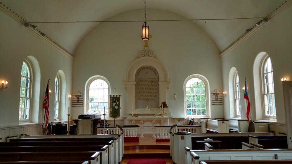 Organ pipes/mechanism in rear gallery, console in front of room, left side of altar.