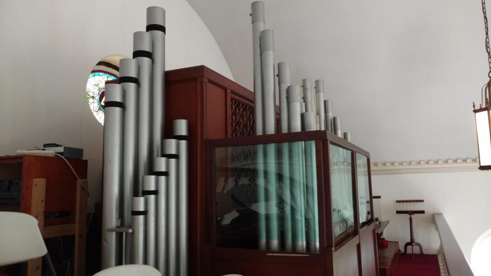Great =8-2 Principal, 16-2 metal Gedackt, 2-2/3 Quint; Swell = 16-2 Stopped Diapason, 8-4 Viola, 4-2 Nachthorn, 16-4 Trompette. Great pipes stand on exposed chest in front of "Moller Artiste" box. A finished wood apron surrounds the exposed front of chests, with plexiglass panels at pipe level to prevent tampering with the pipes. The overall tonal effect is not as it could be, due to the small scaling of the pipes and timid voicing.