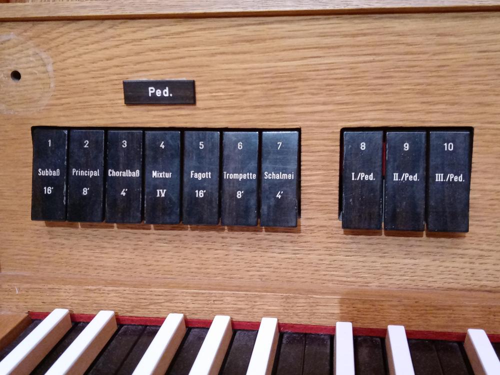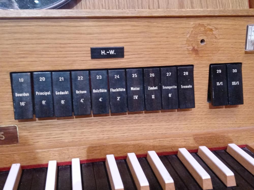 The pipework for the top manual is on the same level as the Hauptwerk and immediately behind the facade. It is a tenor C, V-rank Cornet and the only stop on that manual - so there is no stop action.
