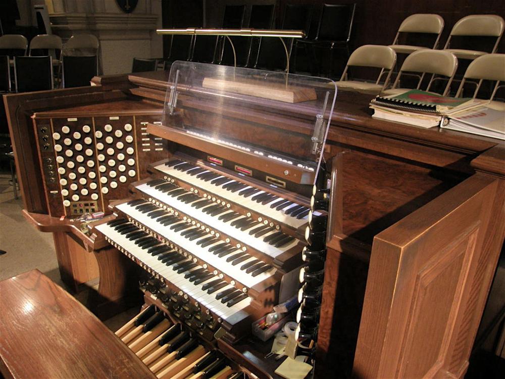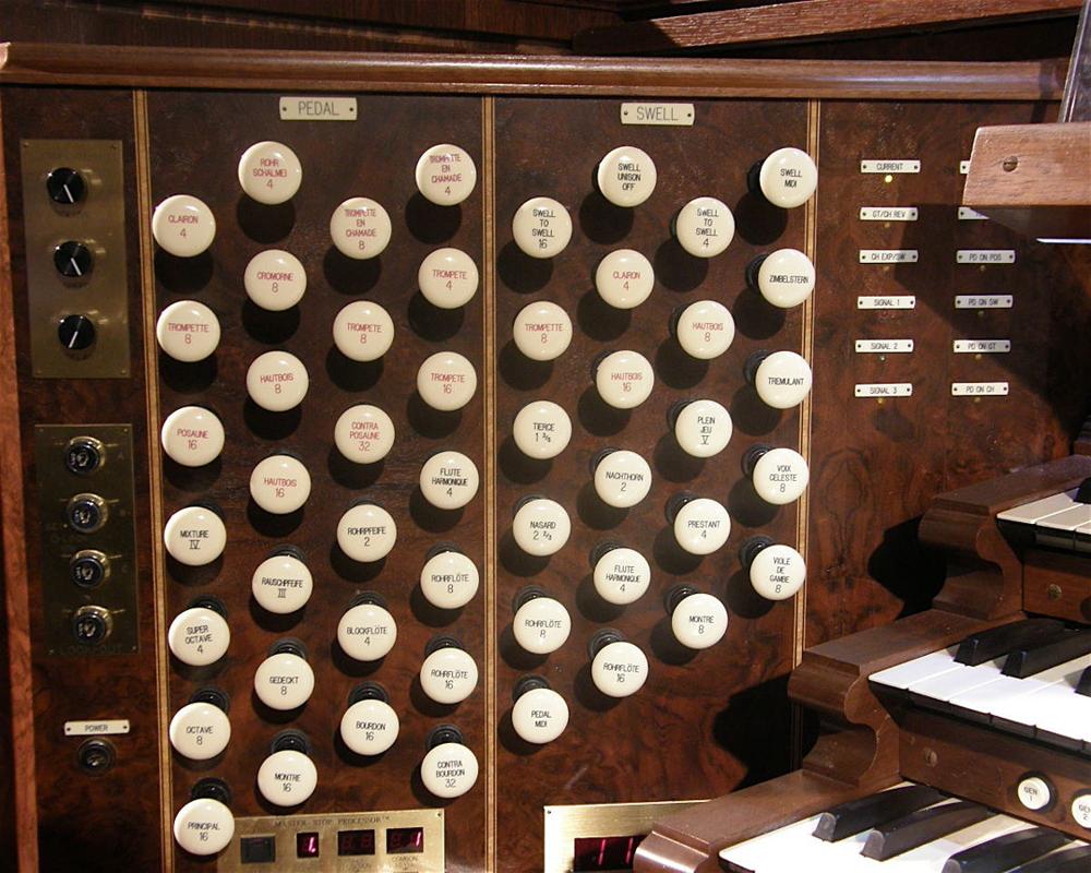 The need to replace the console precipitated the restoration of the entire organ. Originally constructed with four manual divisions but only three manuals, the instrument now has a beautiful, new four-manual console, built by Roger A. Colby, of Johnson City, Tennessee. It is made of oak and burl walnut, with bone and ebony keys, and simulated tracker touch. The Peterson digital combination action is equipped with a piston sequencer, full MIDI capability, and 99 separate levels of memory!