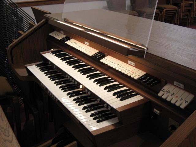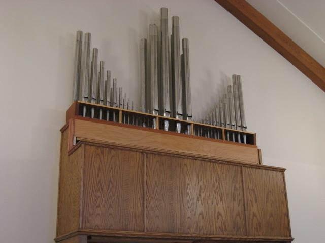 Identified through online information from Chad Boorsma. -- The organ has one rank of Principal pipes that are exposed. All other stops are digital. The console is located at the rear of the room in the center. The pipes and speakers are located on the wall above the console.