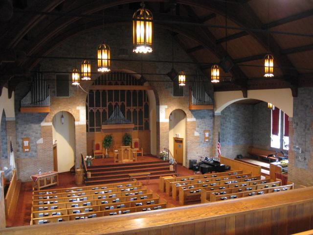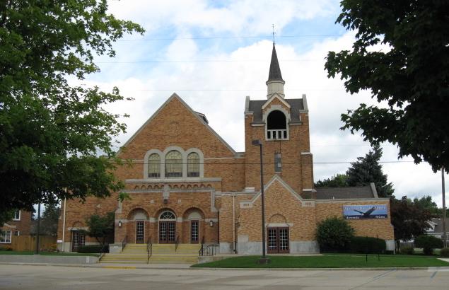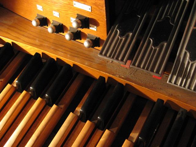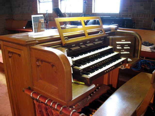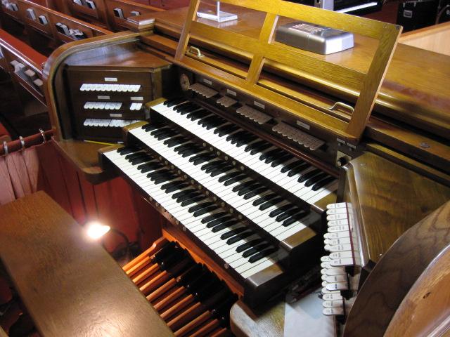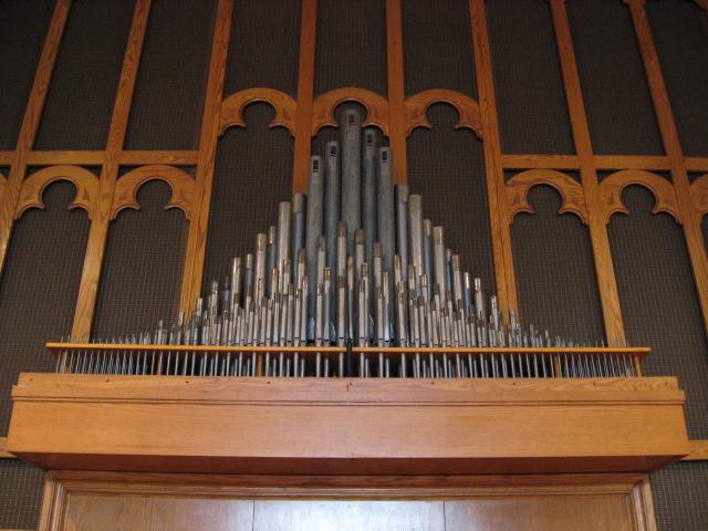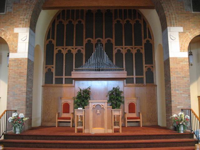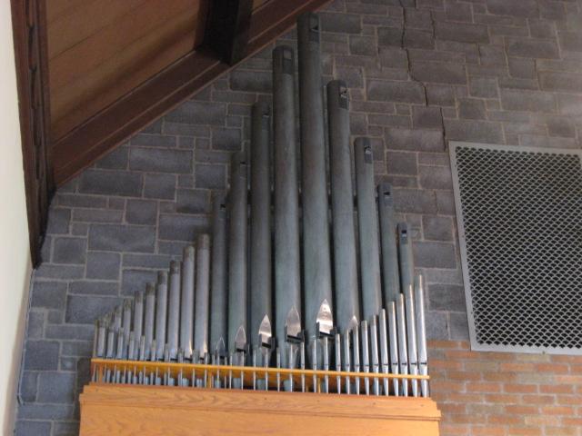 Identified through on-line information from Chad Boorsma. -- The organ was dedicated on April 17, 1958, and was purchased for $24,350. The organist for the dedication concert was Mrs. Blanche V. Packee. The windchests and console are Verlinden's work, but many of the pipes appear to be reused from a different instrument. The pipes -- in sound, appearance, and stop name -- resemble those from the early 1900s. The Great principal chorus is exposed; the rest of the Great and the Choir are under expression together in the center chamber. The Swell is also in the center section, but is under separate expression.