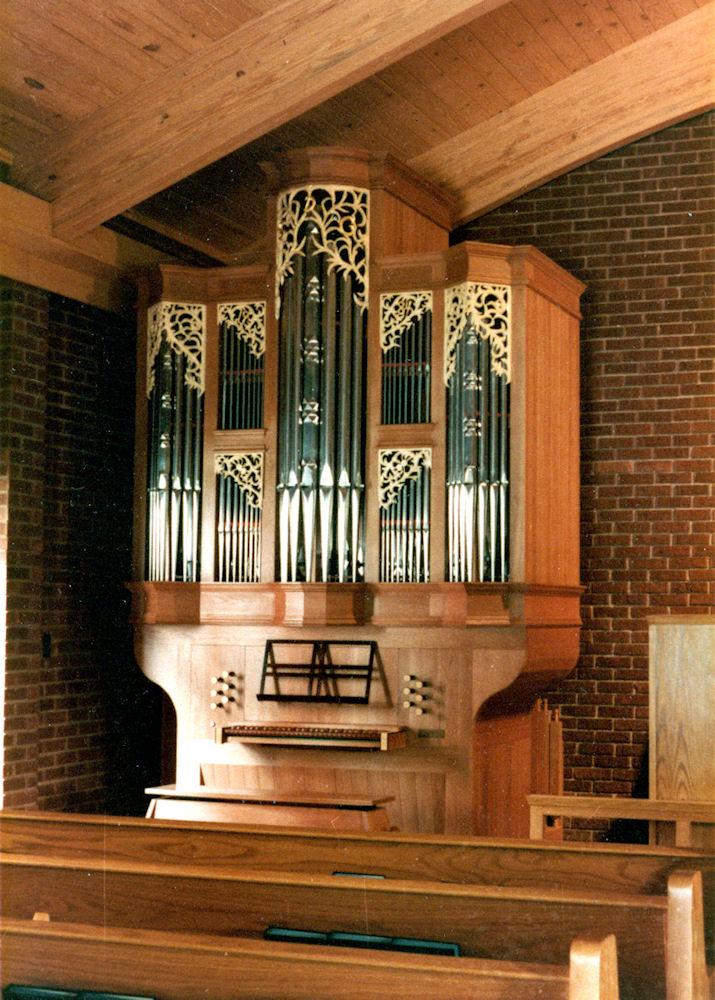 Identified through on-line information from James R. Stettner. -- Oak case with spruce pipe shades. 5-sectional facade. Flexible winding. Reverse-color keys of padouk and elm/ebony. Werckmeister III temperament.