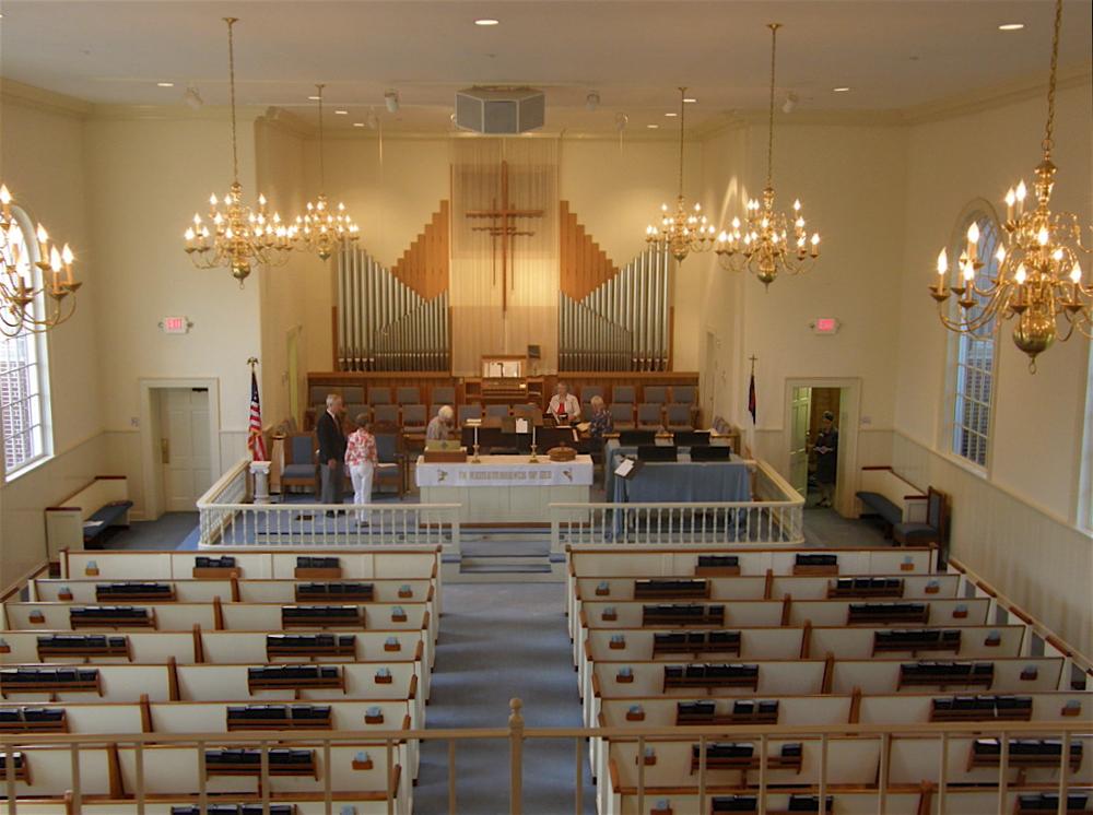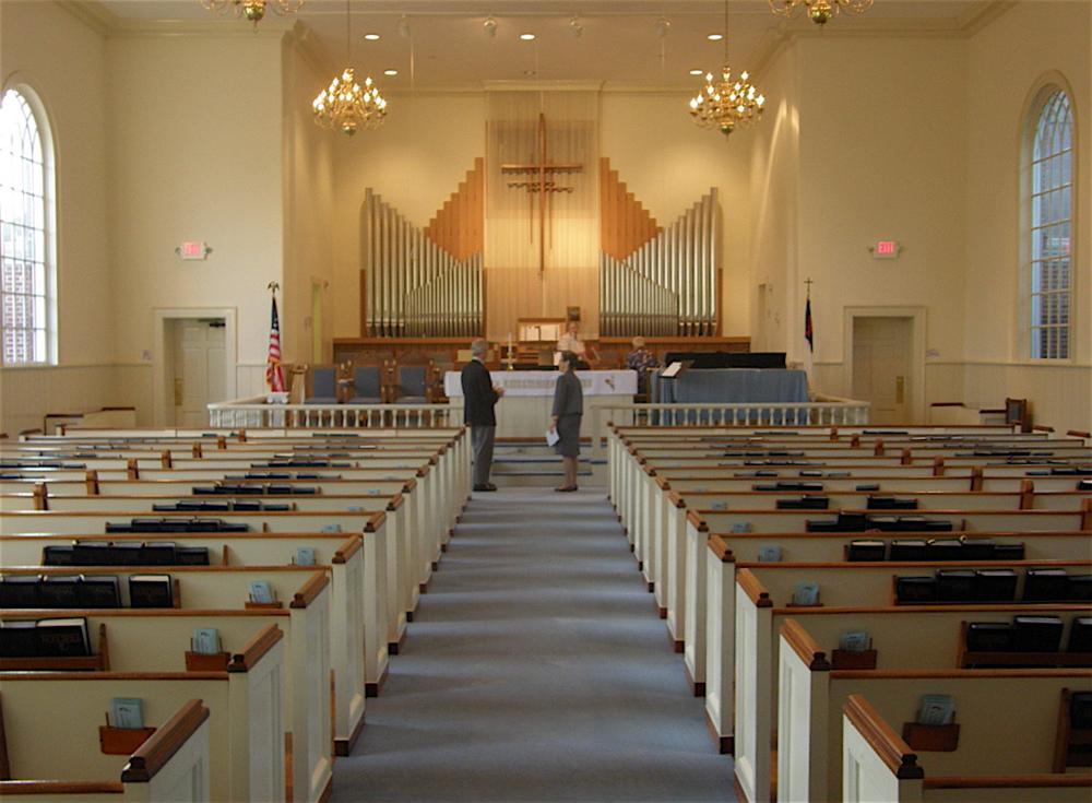 Identified through online information from Stephen Hall. -- Organ is set in center chamber behind chancel wall with Swell above the Great, exposed Principal pipes. A sheer fabric panel hides the Swell shutters and open area above the console between the facade pipes. The facade also includes flat wood panels that appear to be pipes from a distance, but are actually there for visual balance.