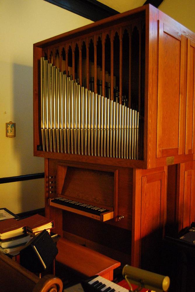 Identified through online information from James R. Stettner. -- Information from the builder's website. From the photo posted, this appears to be one of Heissler's 'Series' organs known as the 'Creglingen'. It is a one-manual organ with four manual registers (8, 4, 2, 1-1/3) and an independent Pedal 16' Subbass.