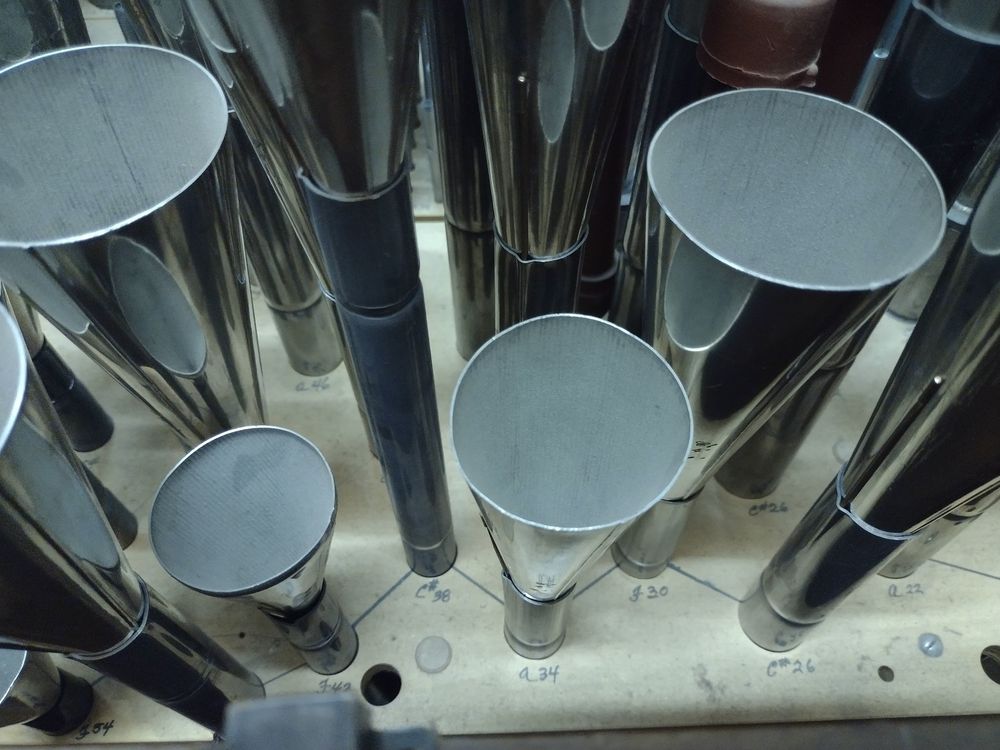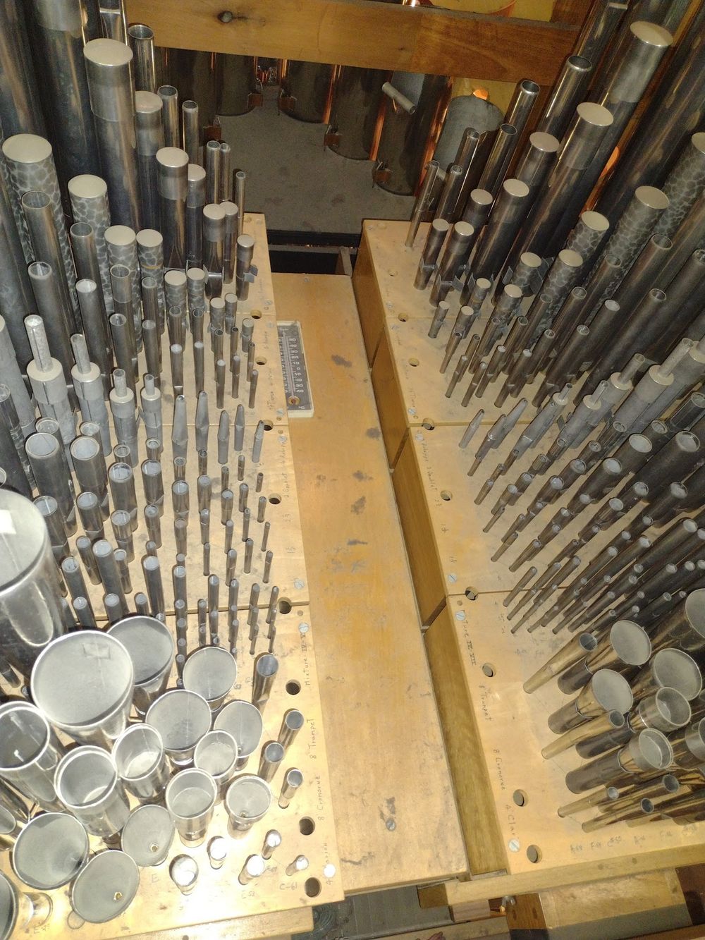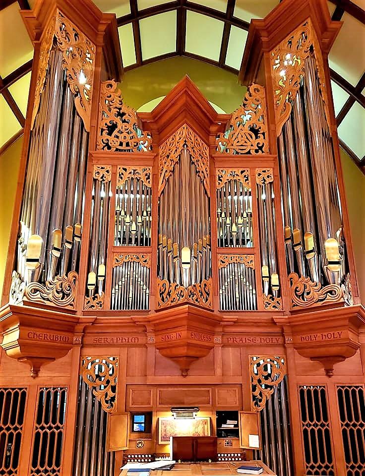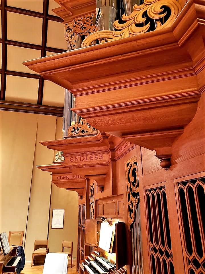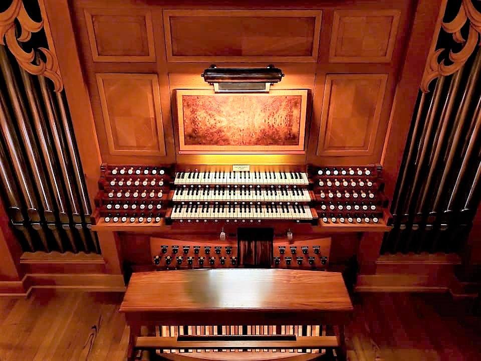 The front pipes are of 75% tin with 23 carat gold leaf applied to the mouths. The casework is of white oak with walnut burl, bocote, and rift sawn white oak. Stopknobs are of ebony, rosewood, and boxwood. Manual keys are of basswood covered with cow bone and ebony. Pedal keys are of beech covered with maple and rosewood. The oak panels on either side of the music rack conceal video monitors, telephone, combination systems controls and music storage.