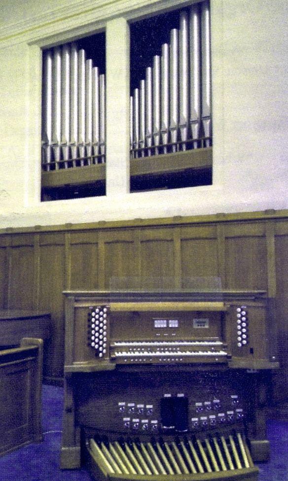The original 1928 Wangerin Organ since its installation in 1928 had some additions made to it, which included a poor 8' Trumpet and the conversion of an original 8' String rank to a a 4' Principal rank Most of the original Wangerin Pipe work was retained in this rebuild but the 8' Trumpet and 4" Octave were not retained in this rebuild and both were later additions to the organ. In this rebuild the single pipe chamber on the upper right of the Sanctuary was divided in half to allow for an enclosed Swell Chamber and an unenclosed Great. In the rebuild the Wangerin Console was not used at all and a new console was constructed. Because of the low ceiling in the Pipe Chamber Haskell pipes were used for at least one rank. At 5 inches of wind pressure the organ puts out a lot of sound. The organ is heavily duplexed and unified to achieve 32 stops including a IV rank mixture out of only 19 ranks of pipes. Very creative use of what was there to work with for an old small organ. It is definitely a vast improvement over the organ I had to work with when I was organist at First Presbyterian from 1986 to 1993.