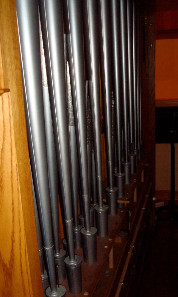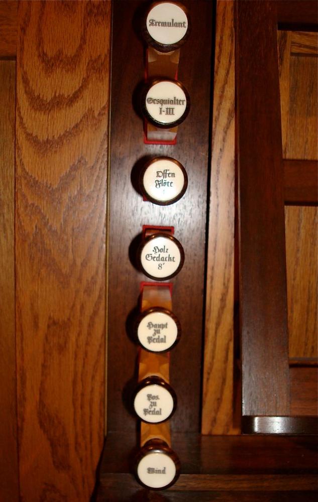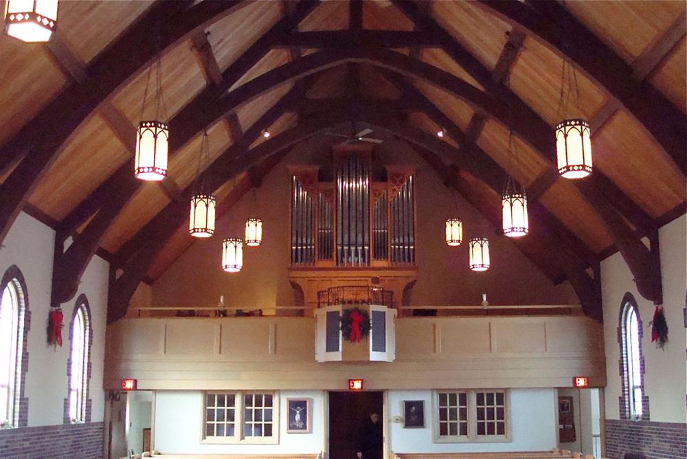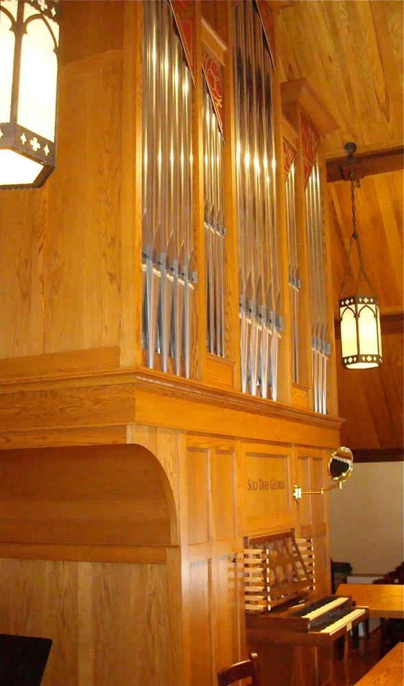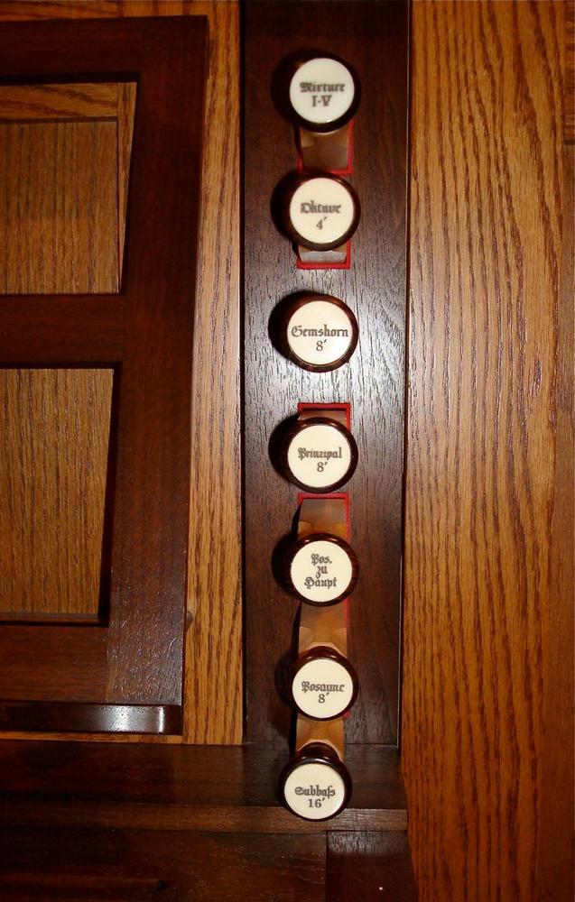 Updated through online information from Rodney J, Weed. -- The information here is from a visit to the Church on January 6, 2013. This little organ has a wonderfully smooth Tracker action. It is very well voiced for the size of the Church and quite beautiful to look at. Both the mixture and sesquialtera are half draw stops meaning only one rank will sound when stop knob is drawn half way and when pulled all the way out all ranks of the stop will sound. The listing of the sesquialtera drawknob as I-III has added a bit of confusion for me as to whether the organ is 14 or 15 ranks. I usually think of a sesquialtera as a II rank stop of 2 2/3' and 1 3/5' pitches. If this organ actually has 3 ranks with this stop then the organ is 15 ranks. One feature I have not seen before is a rotating knob just left of the left stop jam that will adjust the tremolo. The keydesk is not flush with the case but extends out of the case which is not common to many trackers that I have seen.