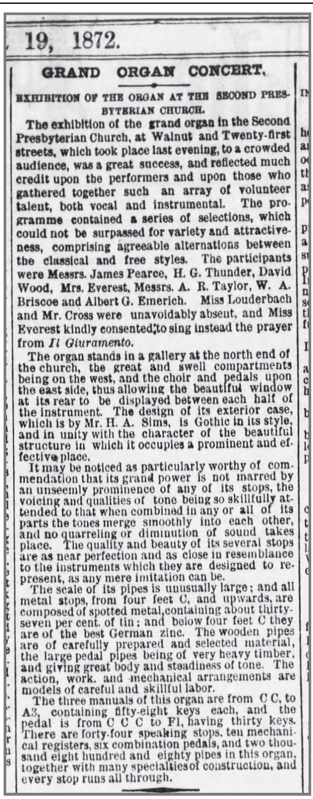 This entry describes an original installation of a new pipe organ. Identified by James R.Stettner, using information from this web site: http://www.fpcphila.org/organ/. -- According to the church website, "W.B.D. Simmons of Boston provided the first instrument at a cost of $13,000. Contemporary accounts of the dedication on October 12, 1872, describe the organ standing in the gallery at the north end of the church while worship was conducted at the opposite end of the nave. This orientation of music and worship was the usual plan in Philadelphia churches of that day. The organ, with 44 stops and 2896 pipes was in two sections, the great and swell compartments being on the west, and the choir and pedal on the east side of the 5-lance Gothic window in the Walnut Street wall. The case was designed by the architect, Henry Augustus Sims, who also designed the church building itself."