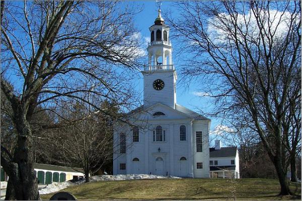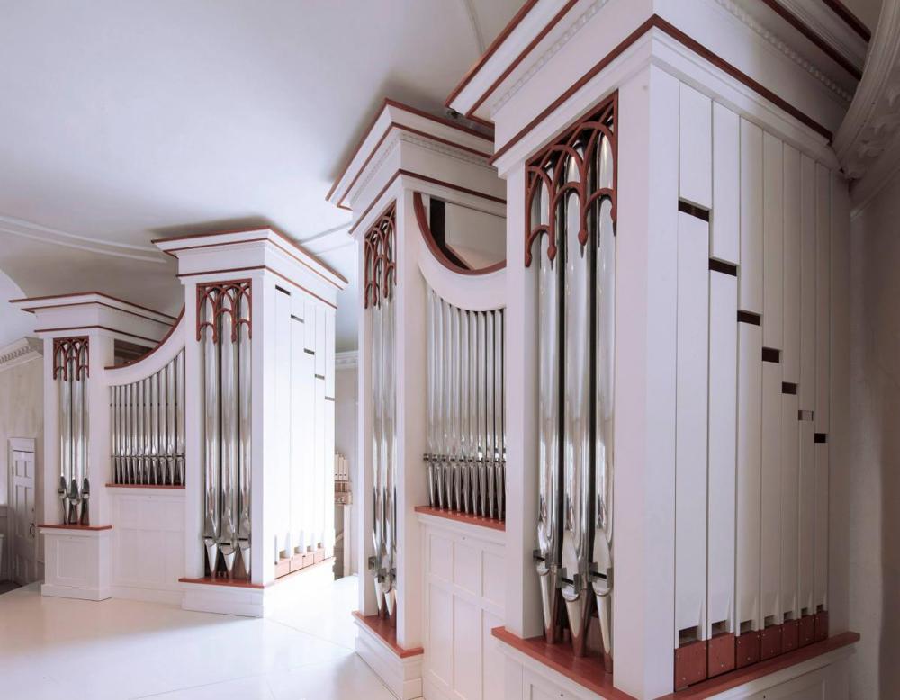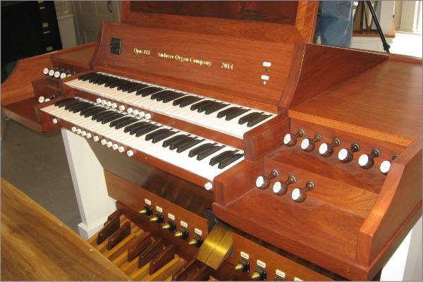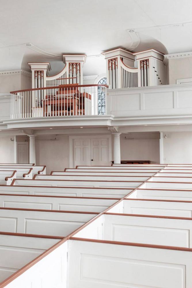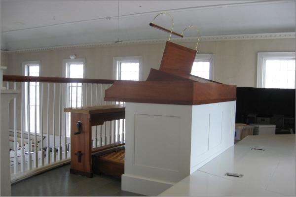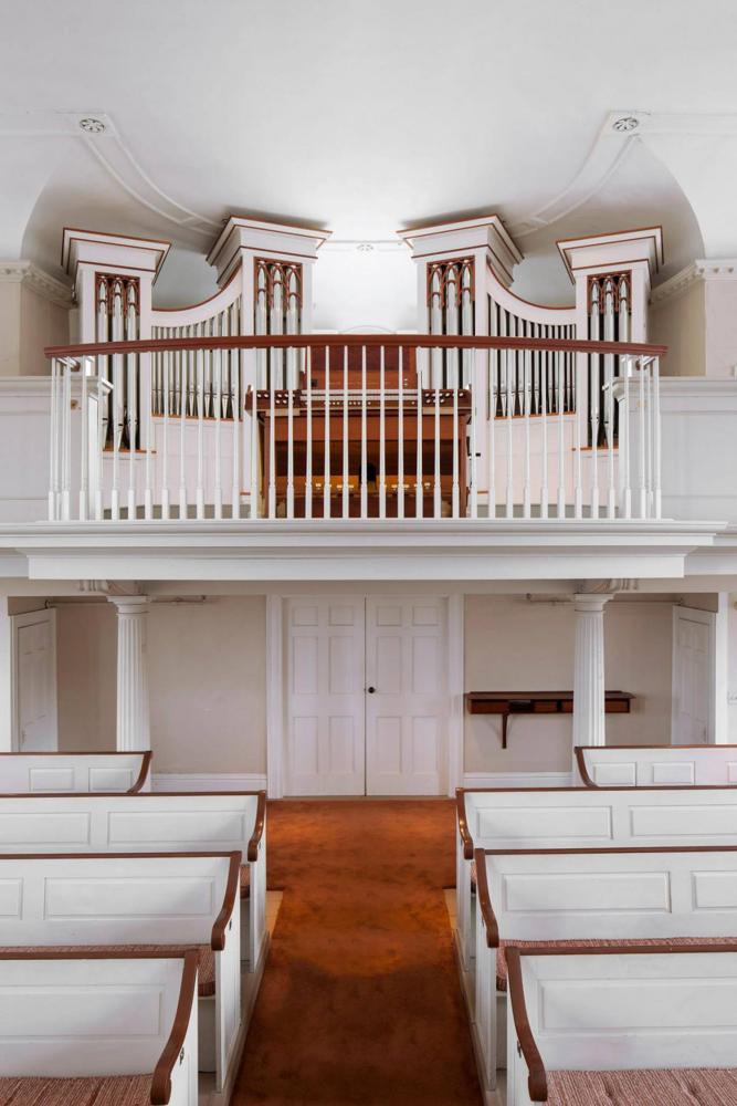 Updated through online information from James R. Stettner. -- The organ is installed in two mirror-image cases in the rear gallery with a detached console facing the cases. This, the fifth pipe organ in this congregation, is the first to allow the central Palladian window to be seen. The Great is in the left case, and the Swell in the right. The Pedal Bourdon and Principal ranks are divided diatonically between the two cases and play on electro-pneumatic action. The white-painted cases have mahogany trim, and the detached console is of oiled mahogany. Each of the twin cases has 18 pipes en facade arranged: 3-12-3. The low 24 pipes of the 16' Bourdon form the outer walls of the four case towers. The polished tin facade pipes comprise the lowest 24 pipes of the Great 8' Principal and the Pedal 4' Choral Bass. The organ was premiered on Palm Sunday, April 13, 2014. The Great has a II Mixture prepared-for.