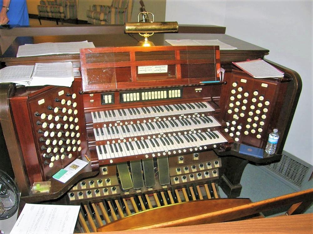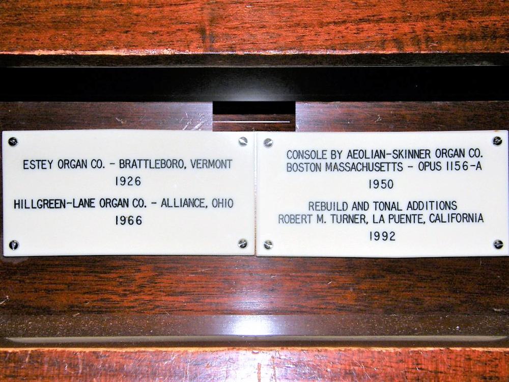 -- Estey Organ Opus 2540 built 1926 for former sanctuary on Rosalind Ave. Revised by Estey in 1954. New console and further revision by Hillgreen and Lane in 1966. Relocated to new campus on Ferncreek Ave in the late 1970's by unknown builder (Jack Bookhardt assisted, but was not the primary builder). Further rebuild and tonal additions by Robert Turner in 1992: Console replaced with a refurbished Aeolian-Skinner console from Opus 1156-A built 1950. (Sources: Console nameplates and personal knowledge)
