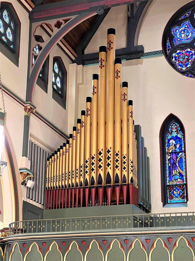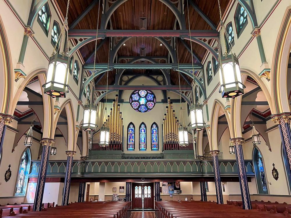 An Antiphonal division in the chancel and four main organ stops are prepared for; the facade pipes in the gallery were stenciled from just above the pipe mouths on up at some point.