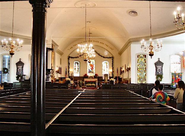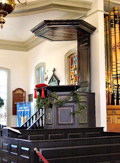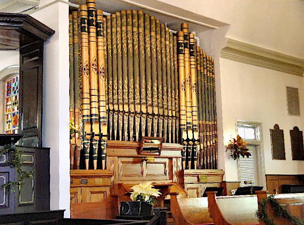 Chancel installation. Unsuccessful attempt at electrification was made c.1960 and organ failed. Remained in place while an Allen was used. Restored 1983-84 Lewis & Hitchcock. Open Diapason and Dulciana basses in case front.