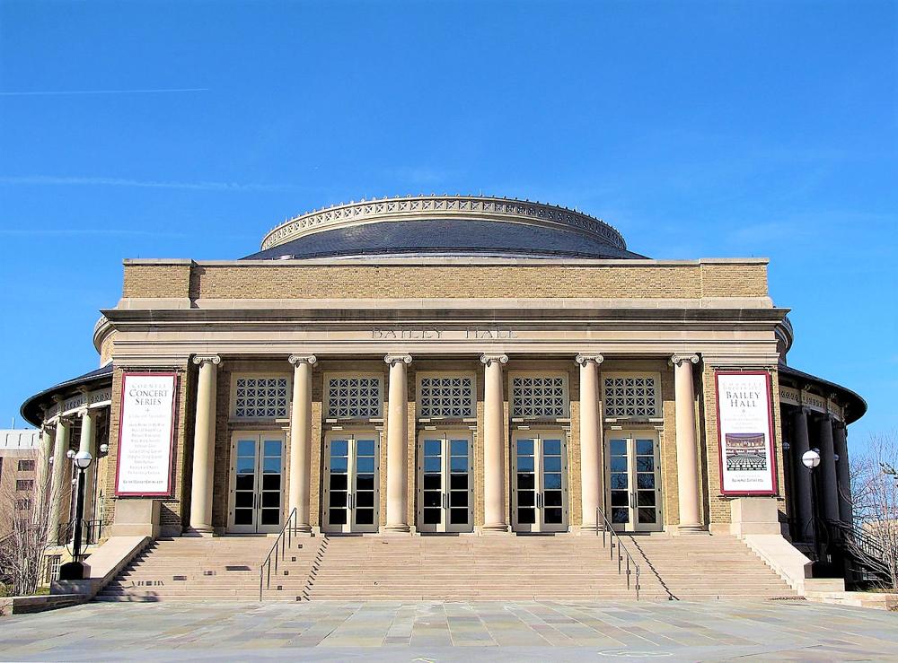 From Wikipedia: Bailey Hall is the largest auditorium at Cornell University, seating 1324 people. It is named for Liberty Hyde Bailey, first dean of what is now Cornell's College of Agriculture and Life Sciences; it was originally built by New York State for the use of agriculture students, but also filled a need for a large auditorium for the whole university. The building was constructed in 1912 according to the Greek Revival architecture design of Buffalo architect Edward Brodhead Green, an 1878 Cornell graduate. It is shaped as an amphitheatre, with a colonnaded portico wrapping around its south side, and monumental stairs leading up to 11-foot main doors. Bailey Hall was added to the National Register of Historic Places in 1984. As originally configured, Bailey seated 1,948; one wag described it as "acoustics by God, seats by Torquemada," referring to its wooden seats and severely raked floor. In 2006, the building reopened after a major rehabilitation which brought it up to modern building codes and made it handicapped-accessible, albeit at the cost of several hundred seats of audience capacity.
