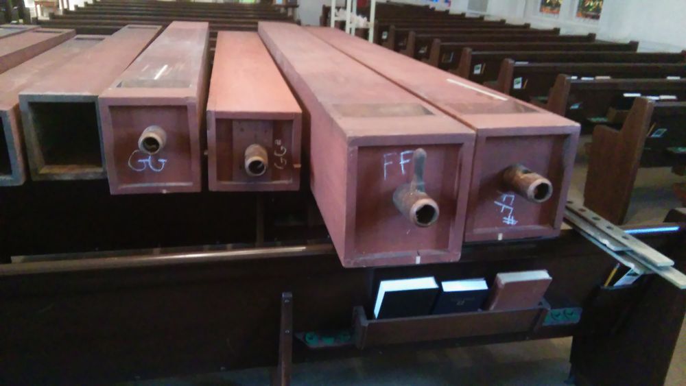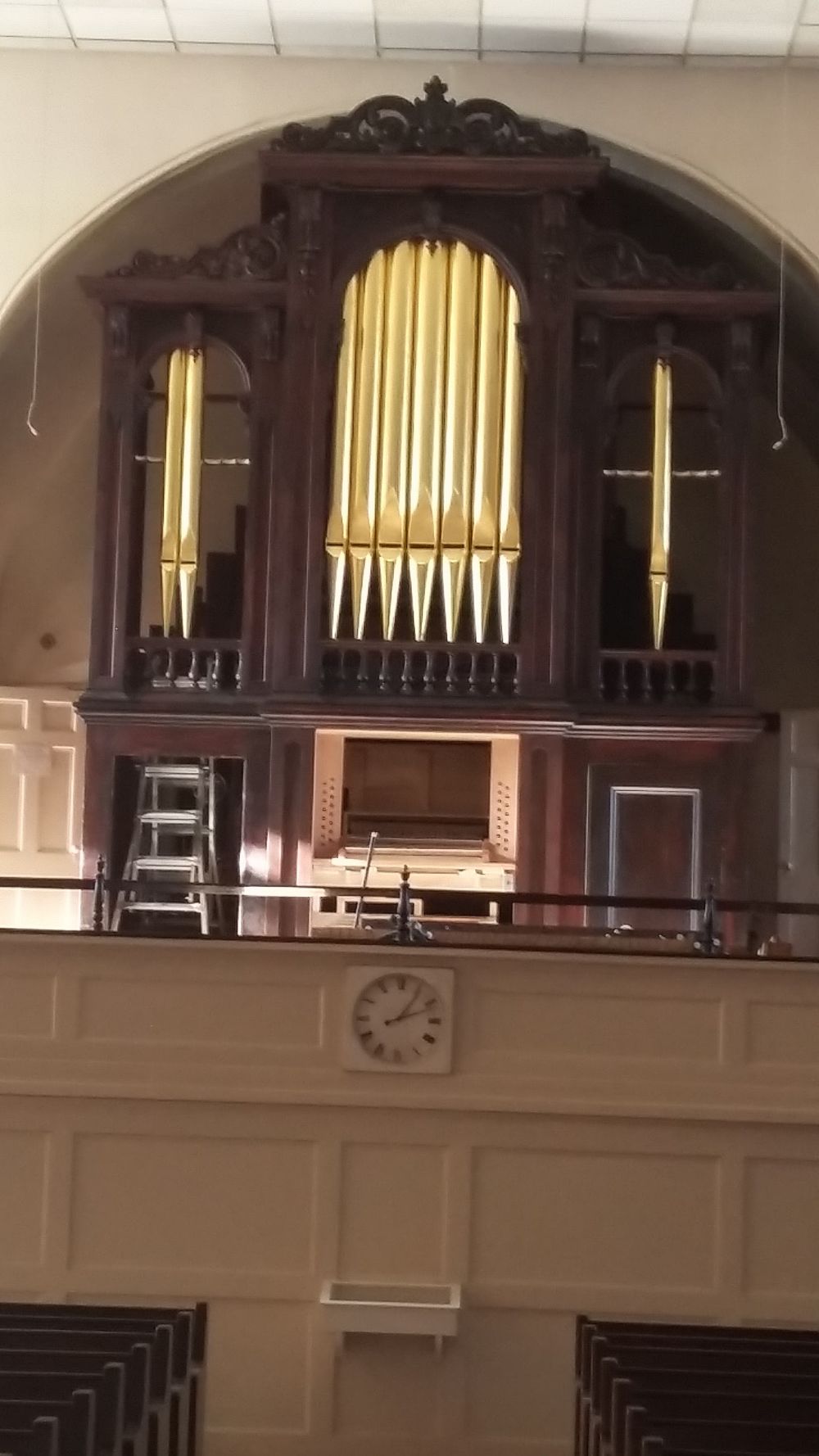 The organ was purchased, removed by Vermont organ builder A. David Moore of North Pomfret, and restored. It was reinstalled inside the extant case of Hammond Street's 1854 Hook. The 1854 Hook had been a bit smaller, so the Pedal 16' Dble Dulciana had to borrow its bottom octave from the Great 8' Dble. Op. Diapason as there was insufficient height and room for the bottom twelve 16' pipes. The entire case also had to be moved away from the back wall about three feet to make room for the Pedal division. The pedalboard of the moved and restored 1861 Hook had also been 25-notes. The pedal compass was increased to 27 notes with the action extended, and all pedal ranks receiving two new pipes to complete the compass. Both the Great 8' Stopped Diapason and 4' Flute have 12 stopped wood basses and are then metal chimney flutes. The Great 4' Clarion is entirely new.