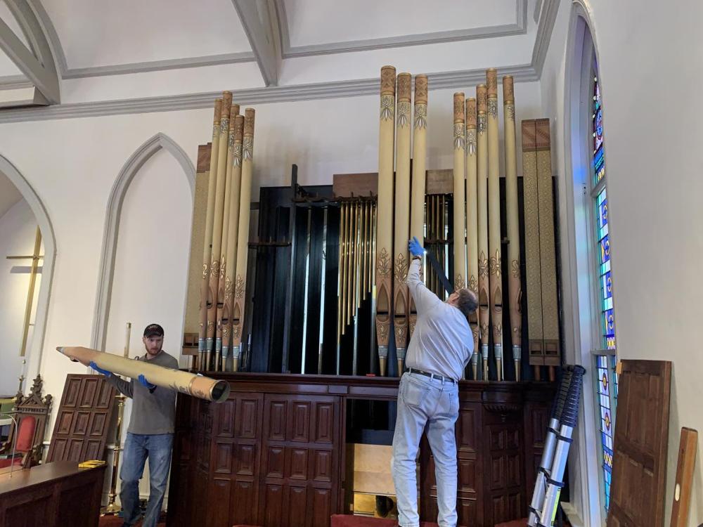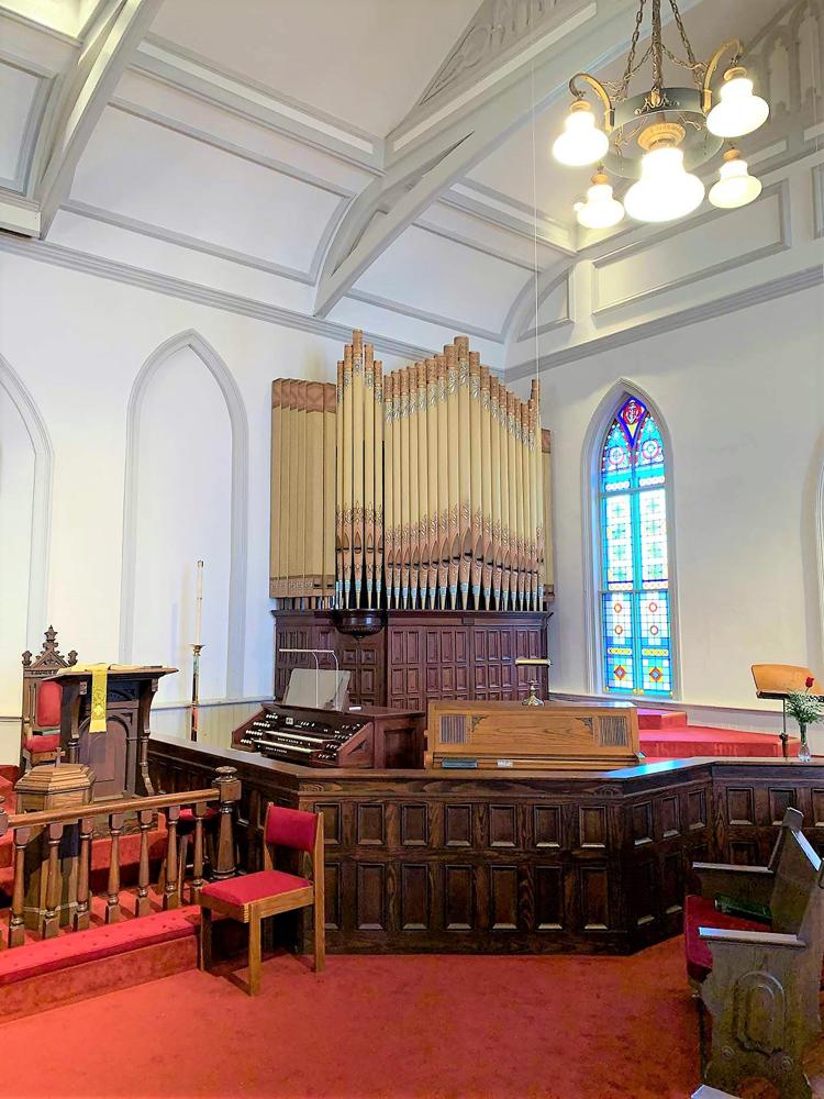 Updated by Charles Kegg <br> <br>This new organ replaced a Moller from the 1970s, which was also placed behind the Felgemaker case. The case pipes were not speaking in the Moller installation. The new Kegg organ uses the center 17 facade pipes as the bass of the otherwise new Great 8\' Diapason. All other materials in the organ are new. No other parts of the Felgemaker organ have survived.