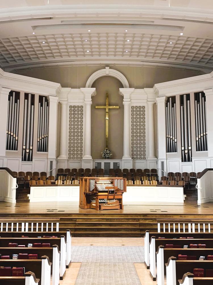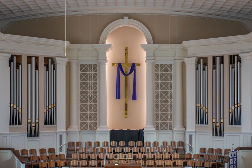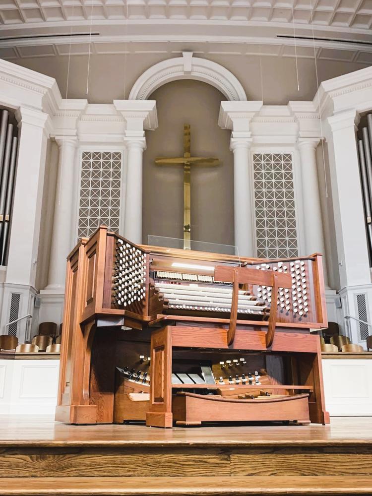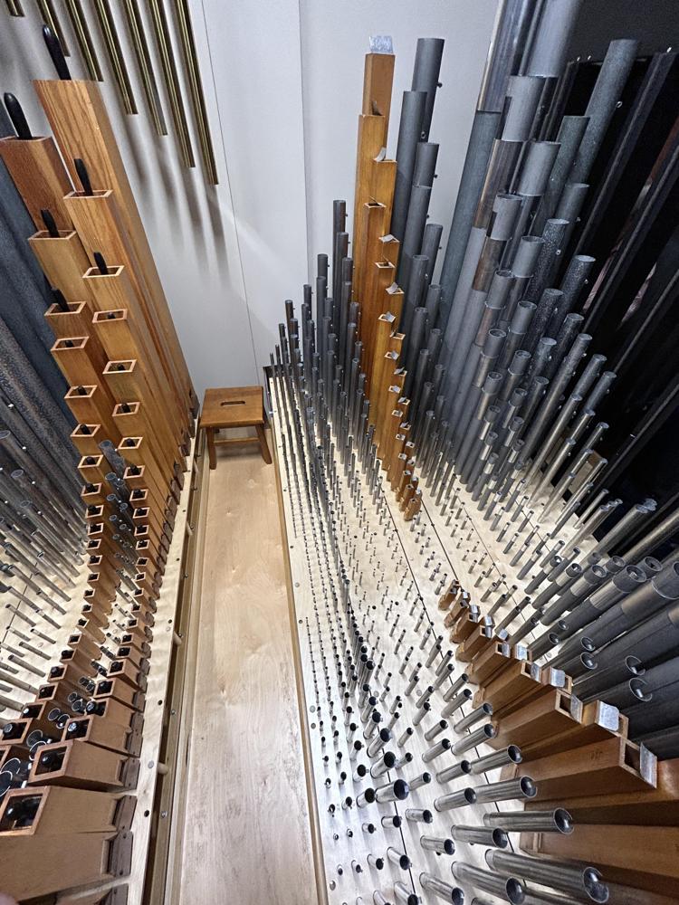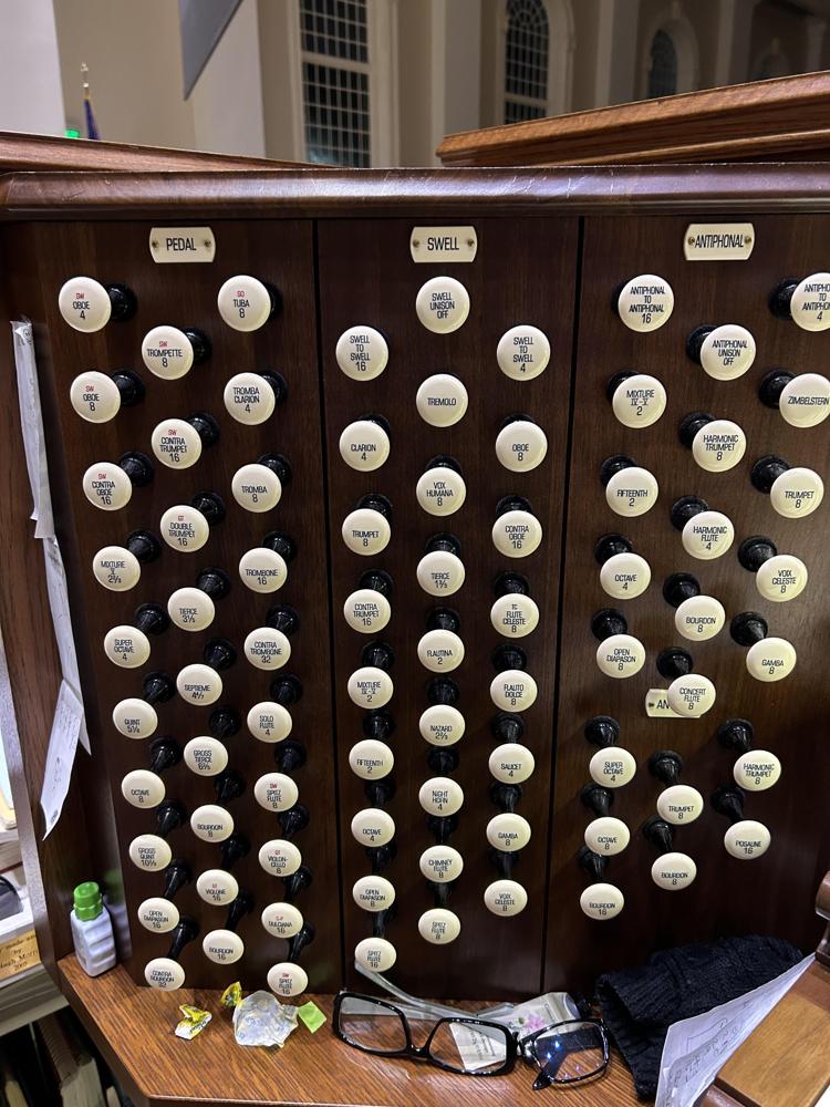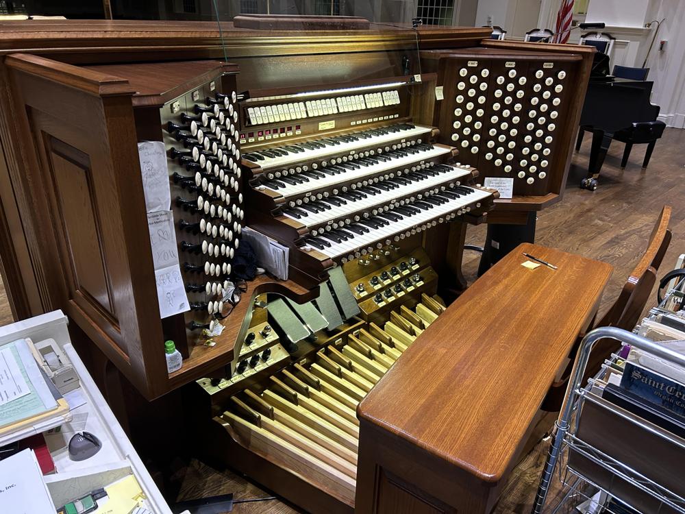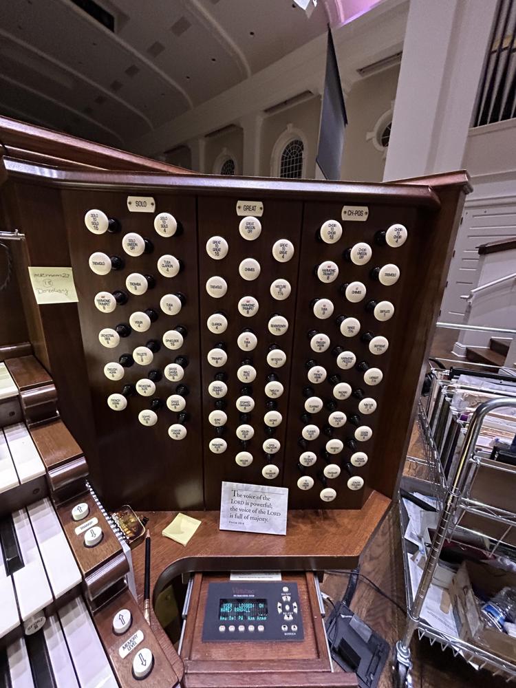 The pipework came from two instruments: the first one came from a 1913 Ernest M. Skinner Organ (Opus 195) from Williamstown College in Williams, MA. and the other one came from a 1939 Casavant Frères (Opus 1600) from the Immaculate Conception Seminary in Darlington, NJ. The Harmonic Trumpet, Chimes & Zimbelstern were carried over from the previous 1972 Schantz organ (Opus 1125). The main blower originally came from the Fourth Presbyterian Church in Chicago, IL after the organ over there was restored by Quimby in 2015, and then reinstalled into the church where it is today. The Antiphonal organ in the back of the church still retains the blower and reservoirs from the 1972 Schantz. This organ features the Integrated Organ Technology Inc. Virtuoso line of control systems.