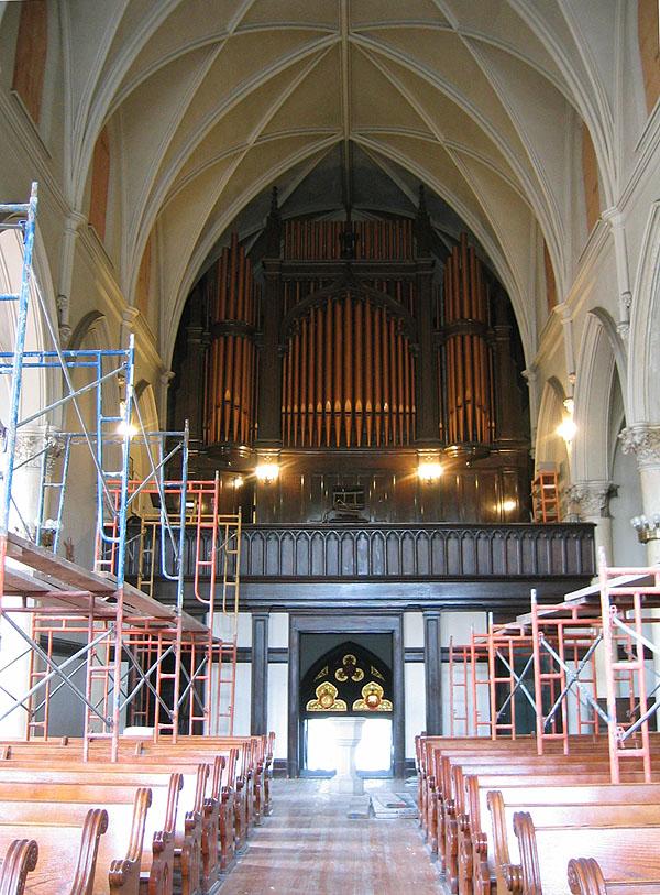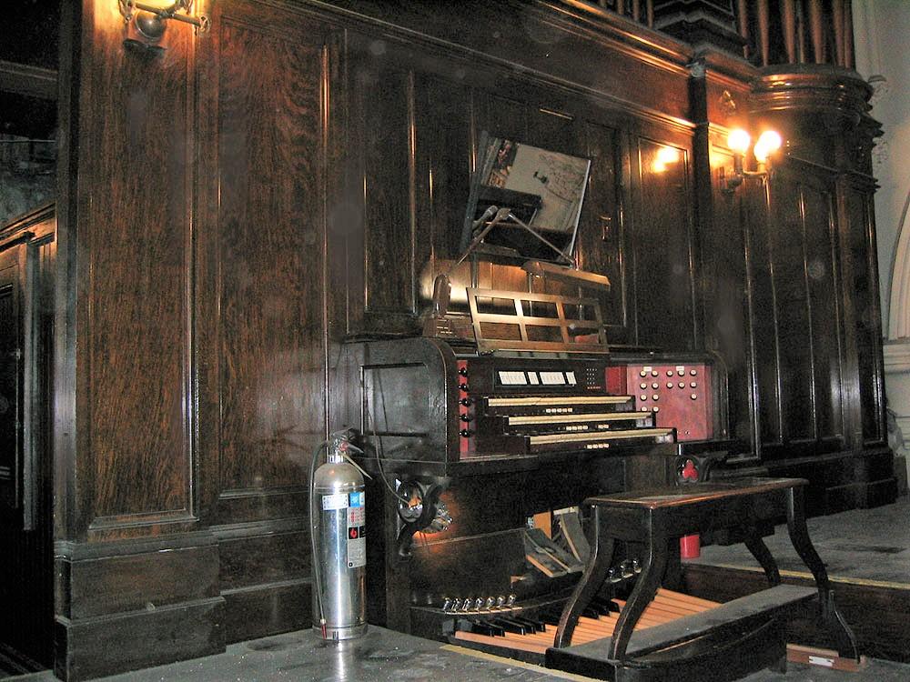 From the NYC AGO NYC Organ Project: The organ in Trinity Lutheran was built in 1909 by the Hutchings Organ Company of Boston. Installed in the gallery behind a black walnut facade with speaking display pipes, the three-manual organ employs electro-pneumatic action. The console, also of black walnut, is attached to the case and has oblique drawknobs in angled stop jambs. James L. Konzelman restored the organ between 1982-89, adding a new 30-note pedalboard and rebuilding the setterboard combination action. Several ranks in the Swell division were replaced in 2011.