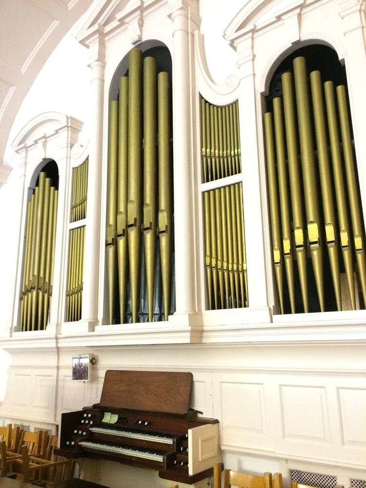 The organ was revoiced by S.L. Huntington, a college acquaintance of the organist Victoria Wagner, in 1988 on a shoestring budget. Plans thereafter to tonally rebuild it with decent new custom pipework were continually shelved. During renovation work in the area behind and around the organ chamber in the early 2000s, the organ was improperly protected-- the chest, chamber and pipework filled with plaster dust and grit-- the church refusing thereafter to allocate the necessary funds to properly depipe the organ and clean it thoroughly.