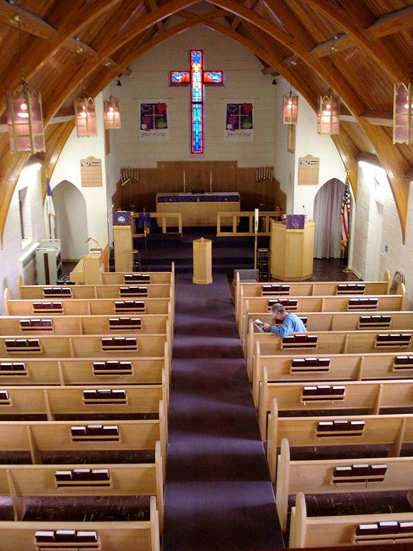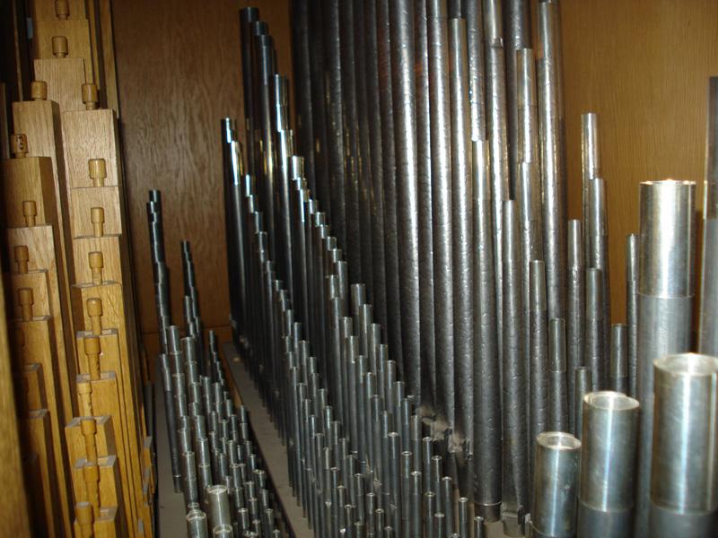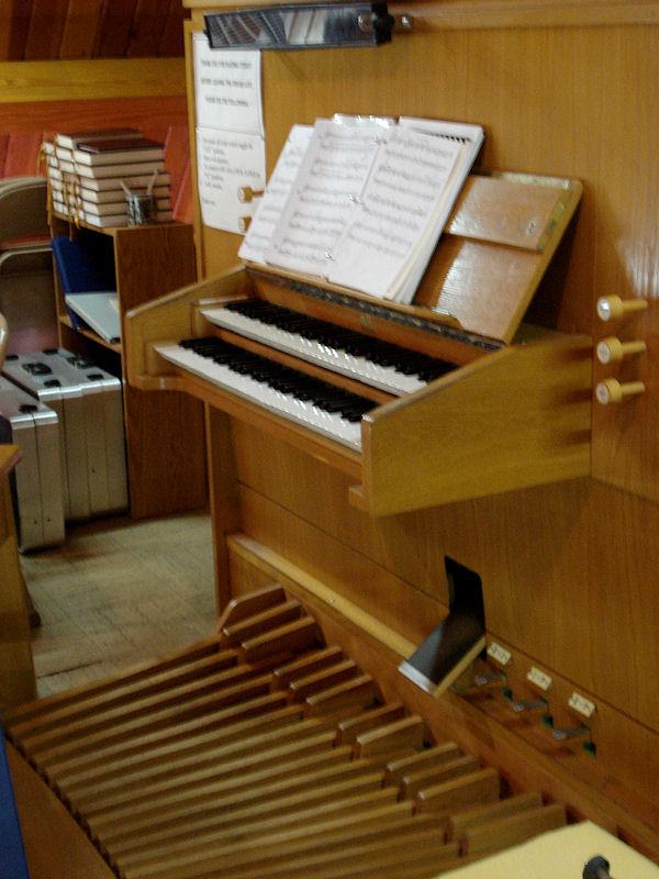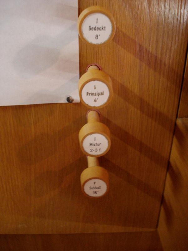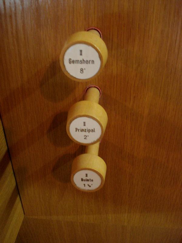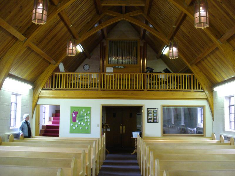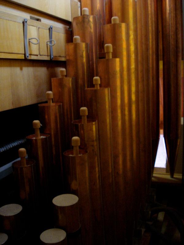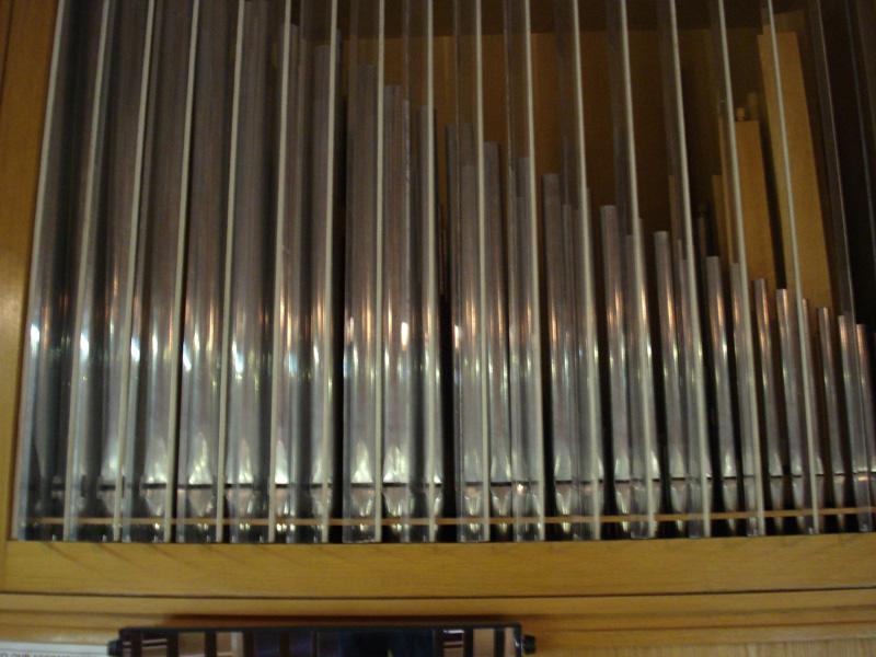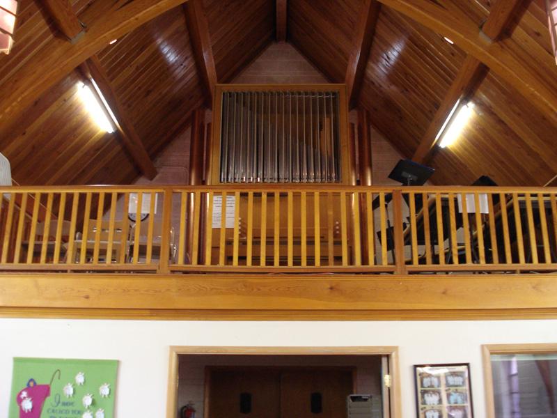 Updated through on-line information from James R. Stettner. -- The organ is installed on the central axis in the rear gallery. Both manual divisions are expressive in a shared enclosure. The expression louvers are plexiglass. The Man. I 4- Prinzipal is visible immediately behind the louvers. The Man. II 8- Gemshorn has capped metal basses. The Pedal 16- Subbass begins as stoppered, open copper pipes before becoming capped spotted metal.