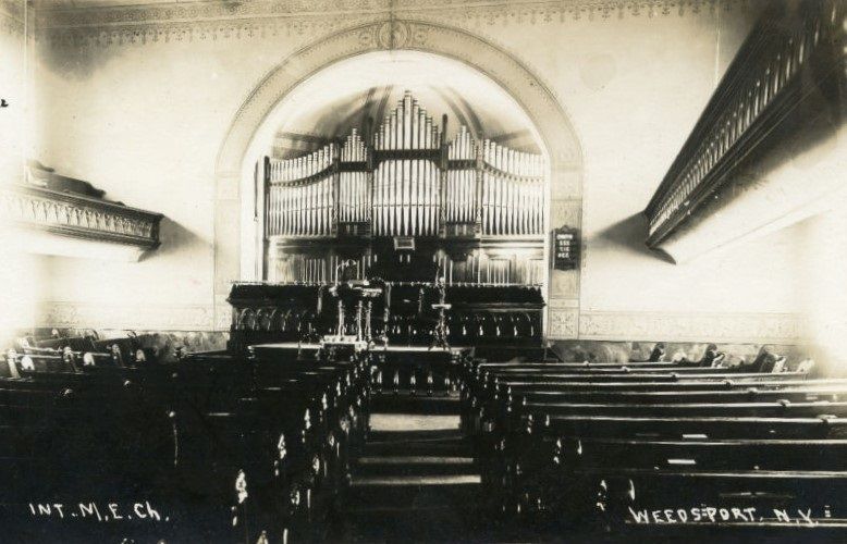 This organ is known from the annotatated William King work list compiled by King researcher Dr. Donald R.M. Patterson and published in The Tracker XVI:4:1972. The annotation for this entry states the organ (in 1972) had been rebuilt and thoroughly altered. The church has no website, but on-line photos on Facebook show limited views of the church interior. The First United Methodist Church in Weedsport has what appears to be a 60s-era A-frame building typical of Methodist churches of the era. Facebook photos of the church have very limited views of the interior, but show no evidence of an organ and videos of church services show the congregation making exclusive use of an upright piano.