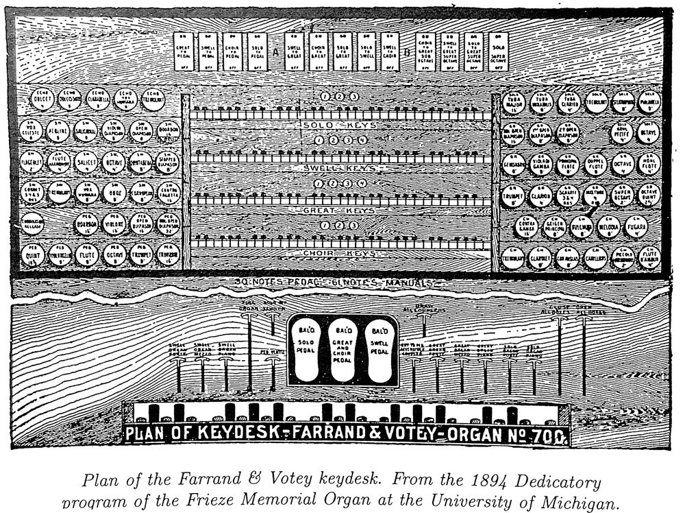 Displayed at the 1893 Columbian Exposition in Chicago. After the fair closed, the organ was purchased for $15,000 by the University Musical Society and installed in University Hall as the Frieze Memorial Organ. Prof. Albert A. Stanley, Director of the University School of Music, played the dedication recital on 14 December 1894. Stanley's programme included works by Bach, Beethoven, Merkel, Widor, Lemmens, Guilmant, Delibes, and Gounod.