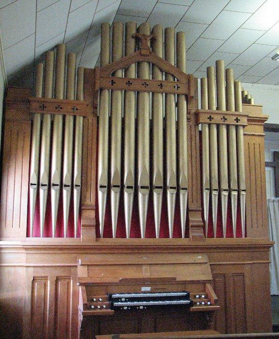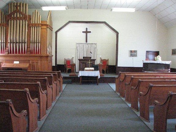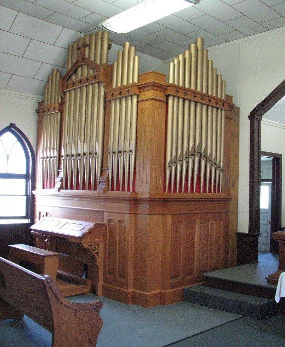 Updated through online information from James Scott. -- Organ is in a non temperature controlled environment but is regularly used by various area churches during the Summer season for worship services. According to the owner, it was moved to this location many years ago from the Presbyterian Church [ed. corr: from the Baptist Church] in Hiawatha, Kansas. The church building, including organ, are also available and used for weddings. A couple of the taller pipes had to be cut and mitered to fit under the ceiling, but it appears to be in pretty much original condition. I played the organ briefly in the very cold room and it sounded fairly good. There were no obvious air leaks, tuning is questionable and the keys are not at all level. Still, nice condition for its age.