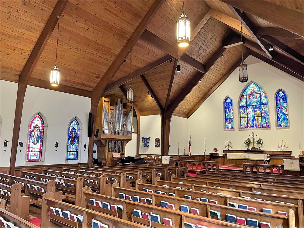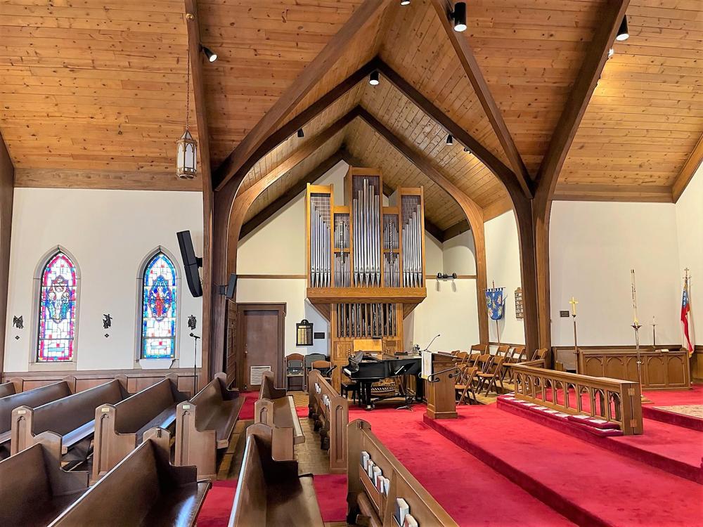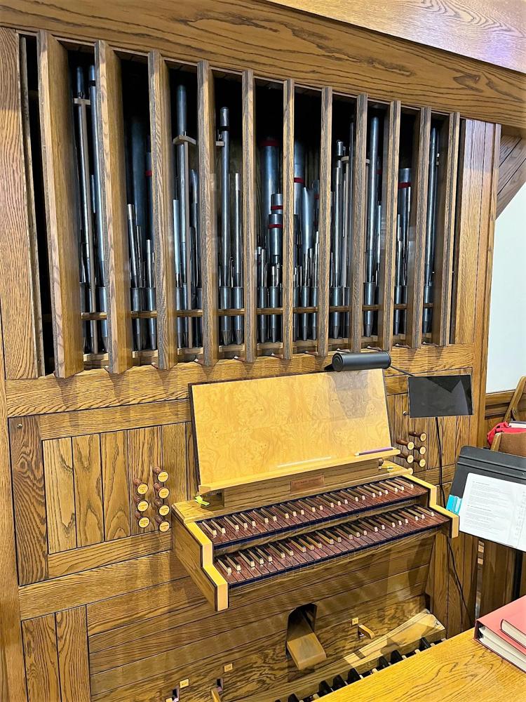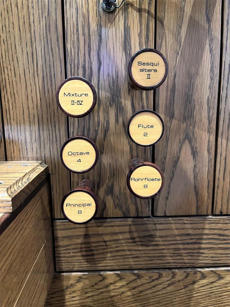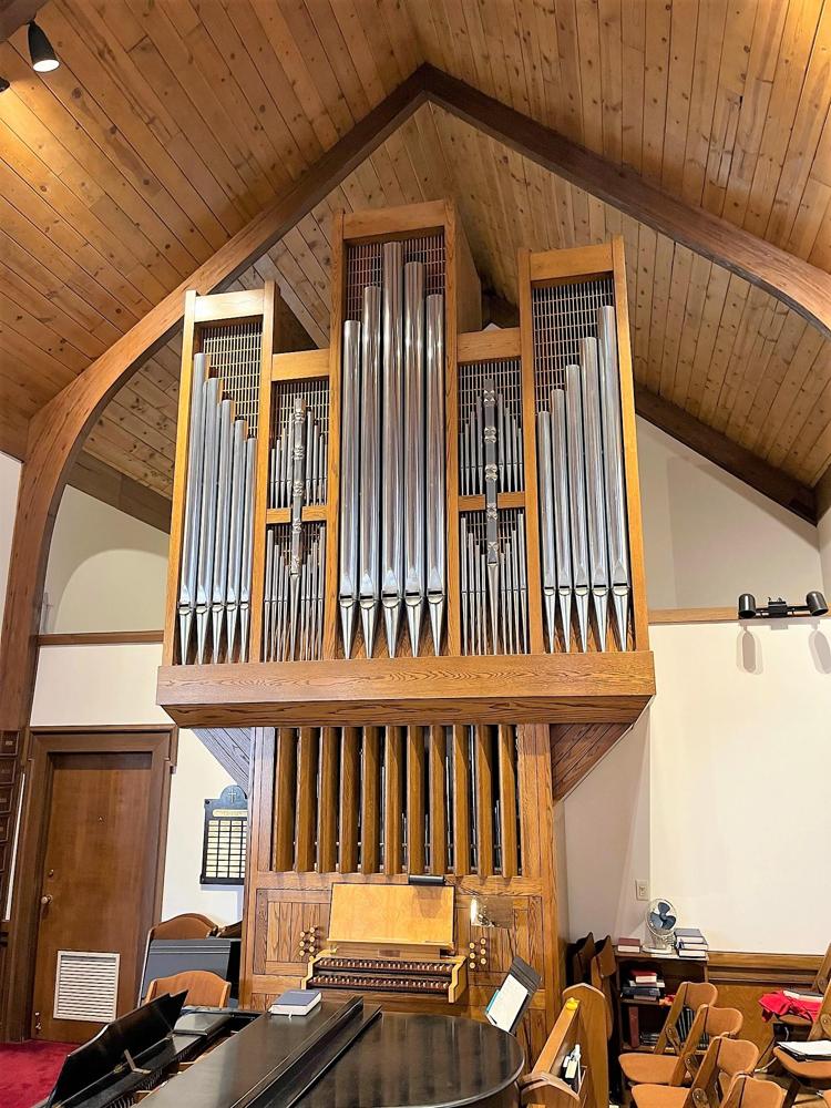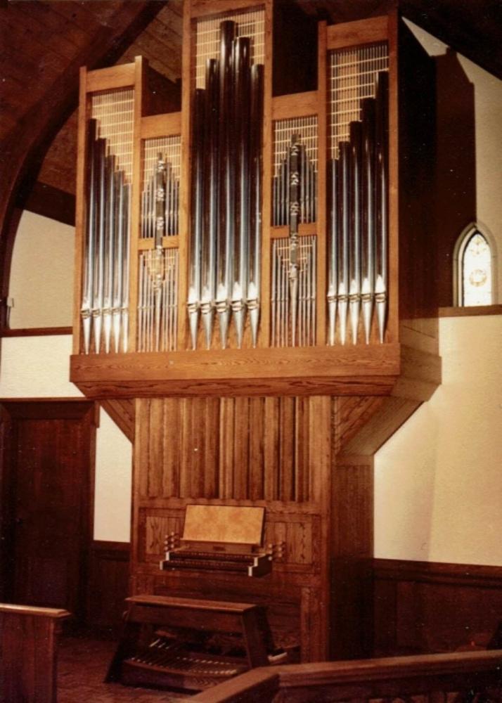 Updated through online information from James R. Stettner. -- Organ in a shallow transept to left of chancel area. Case of white oak. Reverse-color keys of grenadil and elm. Swell in Brustwerk position. 5-sectional case with 49 pipes arranged: 5-17-5-17-5. The middle flats of 17 are divided into upper (8) and lower (8) sections with one large, embossed pipe spanning both sections. Winding via schwimmer regulators. 70 mm w.p.