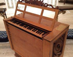 On Sunday, September 29, 1996, a third organ was dedicated in service and recital. This small instrument, the Frederick E . Weber Memorial Continua Positiv Organ, was built by John Brombaugh & Associates Inc. of Eugene, Oregon. The case is of hand-planed Appalachian white oak, oil finished. Carved panels are of oiled American black walnut. The keycheeks are of African zebrawood. Keyboard naturals are of solid satinwood; sharps are of ebony. The windchest is of white oak, sugar pine, western red cedar, Alaska yellow cedar, poplar fine birch plywood, and sheep and cow leather. The stop action is of steel, stainless steel, and brass with hickory bearings. Tuning is equal temperament, A440, transposable one semitone up or down. -- *2007 OHS Atlas*