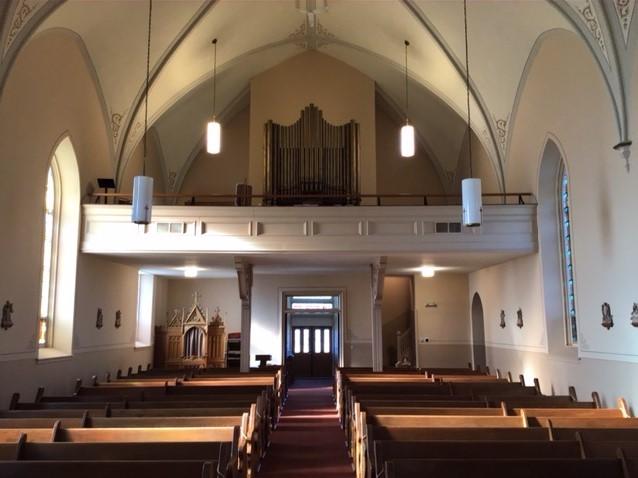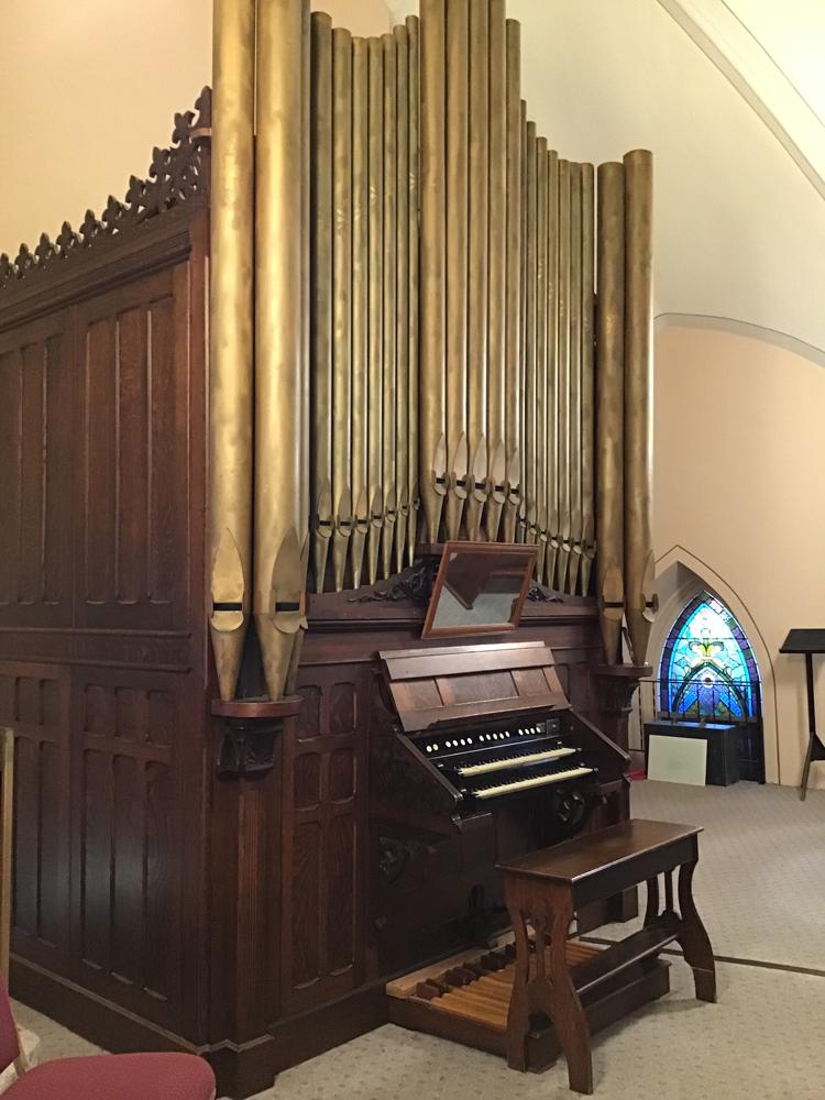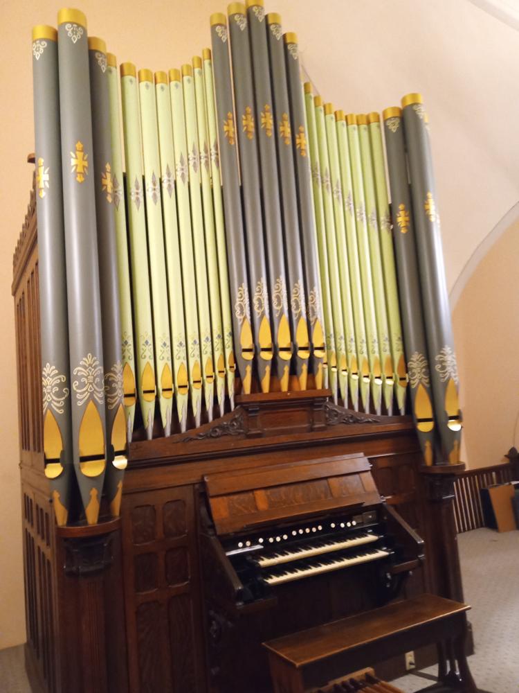 Facade pipes newly stenciled in Spring 2023 by Ken Stancer with assistance provided by Audra Cook, Darek Hartwig and Dale Carder.