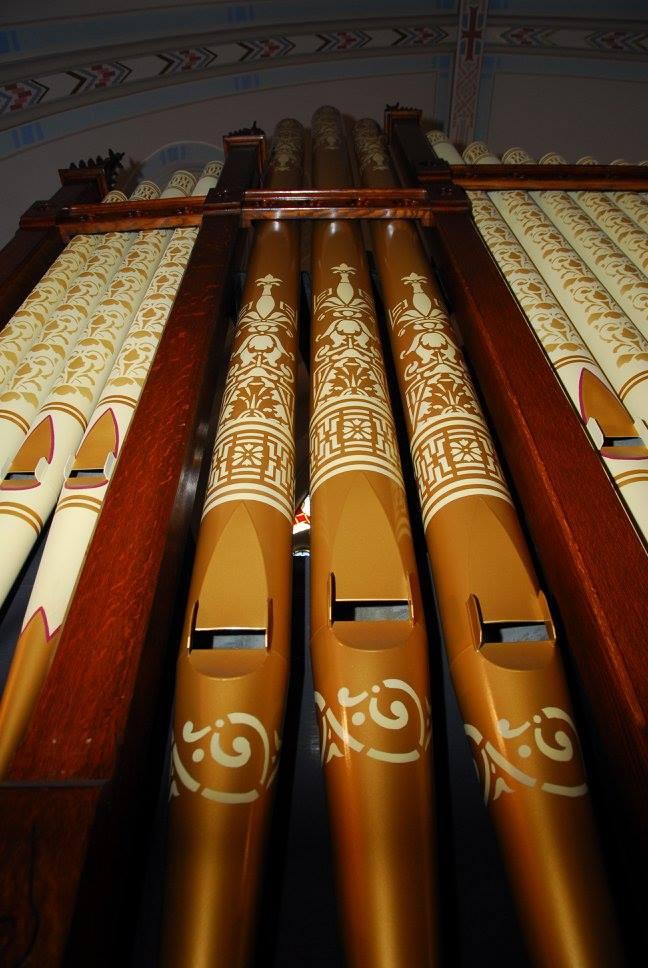 Updated through online information from Christopher Howerter. -- I know a parishioner that lives next to the church and I've played the instrument. They have a contract with the Columbia Organ Works to refurbish the instrument and it should be done by next September. The only sort of combination action is a set of fixed push down toe studs that mechanically push out the stops for the manuals only. There are two for each manual (a swell piano and forte, and a great piano and forte), which are to the left of the swell pedal. The pedal does not have mechanical stop actions, which is different from the manuals. There is also a toe stud on the right of the swell pedal that does not work. The swell pedal is also mechanical.