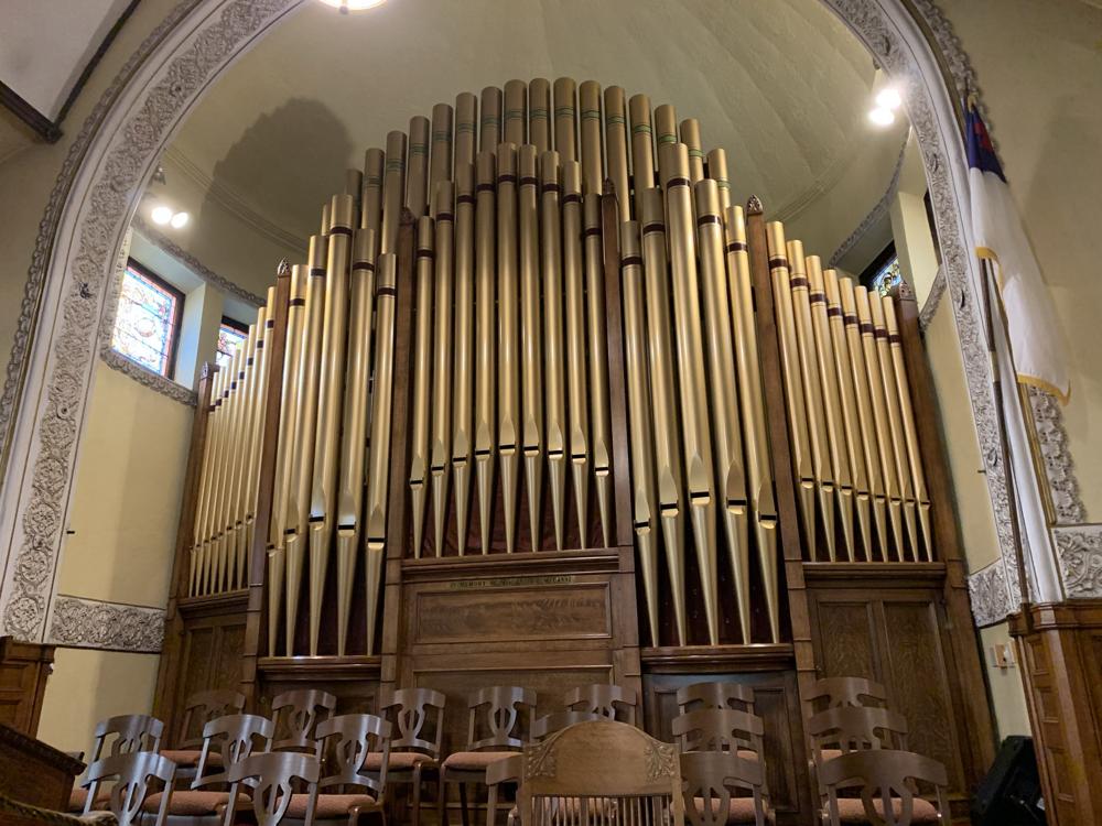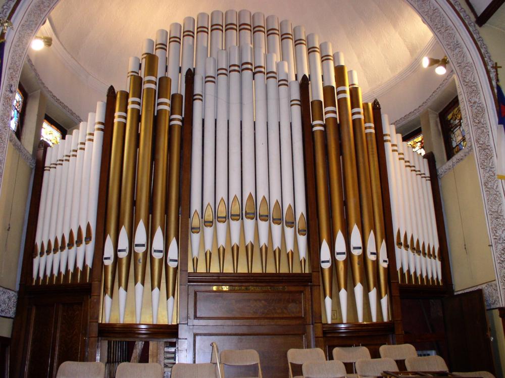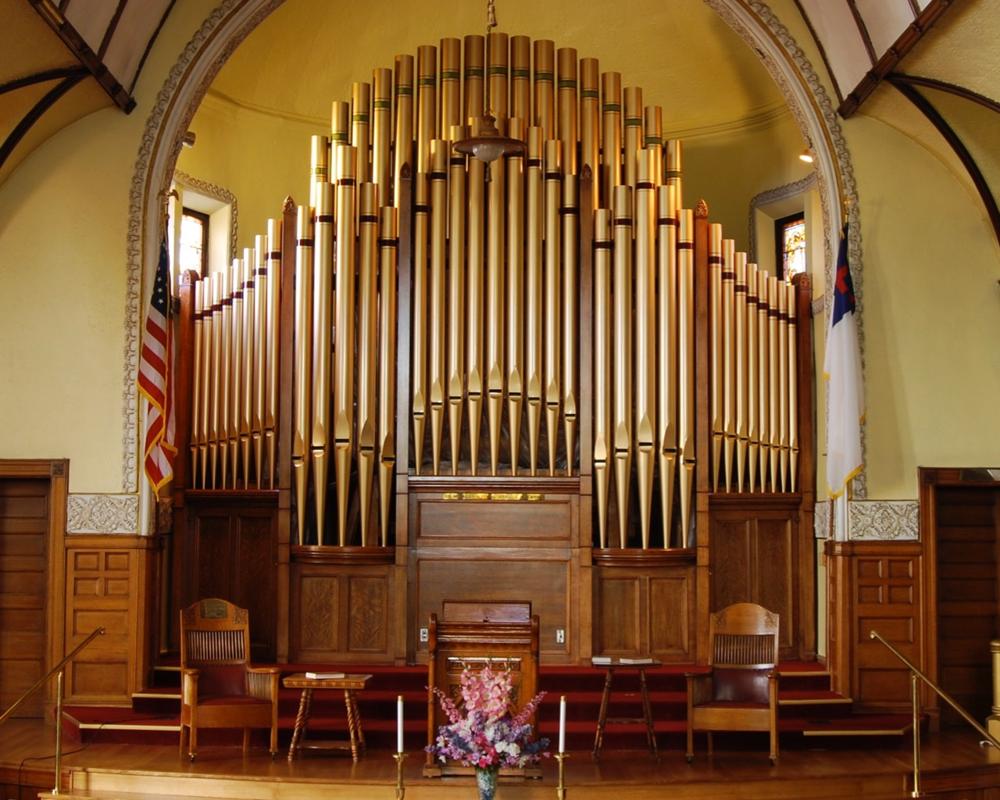 The Kimball, including the facade was restored and mated to the Rodgers in 2007-08. The only tonal change was revoicing the Swell Aeoline to provide a Voix Celeste. The Kimball stops are available on the Rodgers console and are engraved in a different typeface than the Rodgers stops. The top two notes of both Kimball pedal stops are provided by the Rodgers.