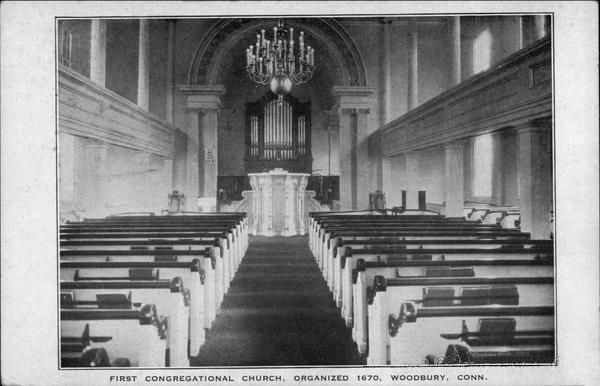 Updated through online information from Mary MacLeod. -- This information is from the 1994 dedication service of the renovated organ: "The First Church organ is now an amalgam of the best in each of two organs: one, the Woodbury First Church Hook and Hastings organ dating from 1873; the other, a 1915 Kimball, Smallman & Frazee organ from First Parish Church, Yarmouth, Maine. The latter was rebuilt with new chests and solid state controls in 1979 by Leighton Organ Service. Charles McManis installed the redesigned instrument with assistance from Austin Organ Service of Avon, CT. Clark Sellars constructed two organ chambers which occupy the full width of the chancel, are almost seven feet deep, and 14 feet high, beginning eight feet above the chancel."